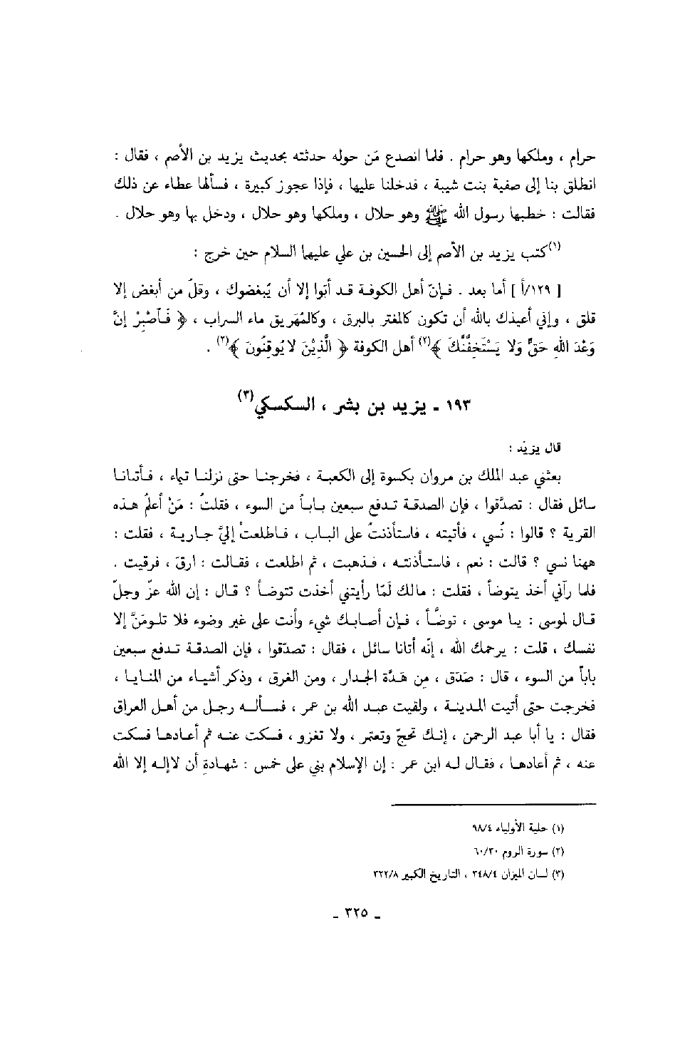 قال يزيد: بعثني عبد الملك بن مروان بكسوة إلى الكعبة، فخرجنا حتى نزلنا تيماء، فأتانا سائل فقال: تصدقوا، فإن الصدقة تدفع سبعين باباً من السوء، فقلت: من أعلم هذه القرية؟ قالوا: نسي، فأتيته، فاستأذنت على الباب، فاطلعت إلي جارية، فقلت: ههنا نسي؟ قالت: نعم، فاستأذنته، فذهبت، ثم اطلعت، فقالت: ارق، فرقيت. فلما رآني أخذ يتوضأ، فقلت: مالك لما رأيتني أخذت تتوضأ؟ قال: إن الله عز وجل قال لموسى: يا موسى، توضأ، فإن أصابك شيء وأنت على غير وضوء فلا تلومن إلا نفسك، قلت: يرحمك الله، إنه أتانا سائل، فقال: تصدقوا، فإن الصدقة تدفع سبعين باباً من السوء، قال: صدق، من هدة الجدار، ومن الغرق، وذكر أشياء من المنايا، فخرجت حتى أتيت المدينة، ولقيت عبد الله بن عمر، فسأله رجل من أهل العراق فقال: يا أبا عبد الرحمن، إنك تحج وتعمر، ولا تغزو، فسكت عنه ثم أعادها فسكت عنه، ثم أعادها، فقال له ابن عمر: إن الإسلام بني على خمس: شهادة أن لا إله إلا الله
