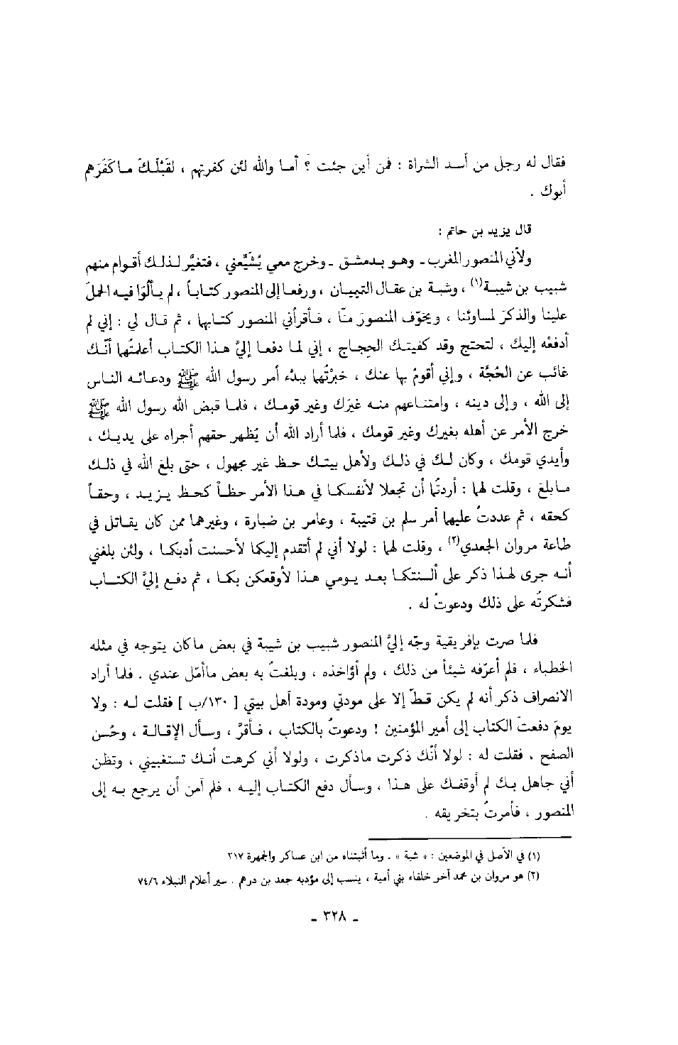 قال يزيد بن حاتم: ولاني المنصور المغرب - وهو بدمشق - وخرج معي يشيعني، فتغير لذلك أقوام منهم شبيب بن شيبة، وشبة بن عقال التميميان، ورفعا إلى المنصور كتاباً، لم يألوا فيه الحمل علينا والذكر لمساوئنا، ويخوف المنصور منا، فأقرأني المنصور كتابهما، ثم قال لي: إني لم أدفعه إليك، لتحتج وقد كفيتك الحجاج، إني لما دفعا إلي هذا الكتاب أعلمتهما أنك غائب عن الحجة، وإني أقوم بها عنك، خبرتهما ببدء أمر رسول الله صَلَّى اللهُ عَلَيْهِ وَسَلَّمَ ودعائه الناس إلى الله، وإلى دينه، وامتناعهم منه غيرك وغير قومك، فلما قبض الله رسول الله صَلَّى اللهُ عَلَيْهِ وَسَلَّمَ خرج الأمر عن أهله بغيرك وغير قومك، فلما أراد الله أن يظهر حقهم أجراه على يديك، وأيدي قومك، وكان لك ولأهل بيتك حظ غبر مجهول، حتى بلغ الله في ذلك ما بلغ، وقلت لهما: أردتما أن تجعلا لأنفسكما في هذا الأمر حظاً كحظ يزيد، وحقاً كحقه، ثم عددت عليهما أمر سلم بن قتيبة، وعامر بن ضبارة، وغيرهما ممن كان يقاتل في طاعة مروان الجعدي، وقلت لهما: لولا أني لم أتقدم إليكما لأحسنت أدبكما، ولئن بلغني أنه جرى لهذا ذكر على ألسنتكما بعد يومي هذا لأوقعكن بكما، ثم دفع إلي الكتاب فشكرته على ذلك ودعوت له.
