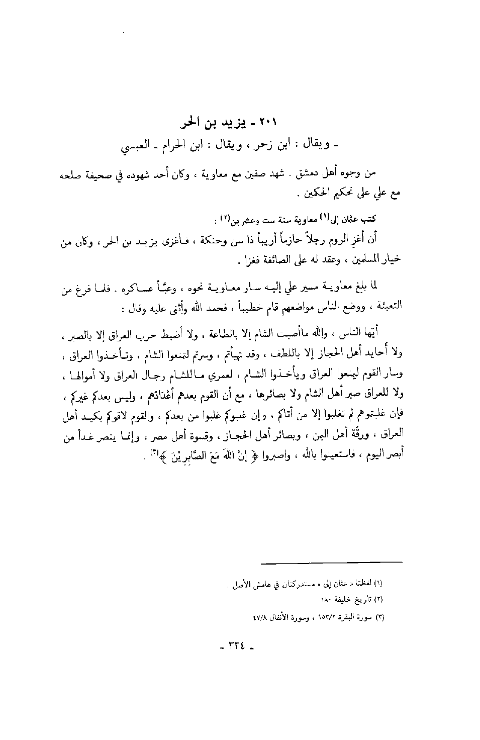 لما بلغ معاوية مسير علي إليه سار معاوية نحوه، وعبأ عساكره. فلما فرغ من التعبئة، ووضع الناس مواضعهم قام خطيباً، فحمد الله وأثنى عليه وقال: أيها الناس، والله ما أصبت الشام إلا بالطاعة، ولا أضبط حرب العراق إلا بالصبر، ولا أحايد أهل الحجاز إلا باللطف، وقد تهيأتم، وسرتم لتمنعوا الشام، وتأخذوا العراق، وسار القوم ليمنعوا العراق ويأخذوا الشام، لعمري ما للشام رجال العراق ولا أموالها، ولا للعراق صبر أهل الشام ولا بصائرها، مع أن القوم بعدهم أعدادهم، وليس بعدكم غيركم، فإن غلبتموهم لم تغلبوا إلا من أتاكم، وإن غلبوكم غلبوا من بعدكم، والقوم لاقوكم بكيد أهل العراق، ورقة أهل اليمن، وبصائر أهل الحجاز، وقسوة أهل مصر، وإنما ينصر غداً من أبصر اليوم، فاستعينوا بالله، واصبروا " إن الله مع الصابرين ".