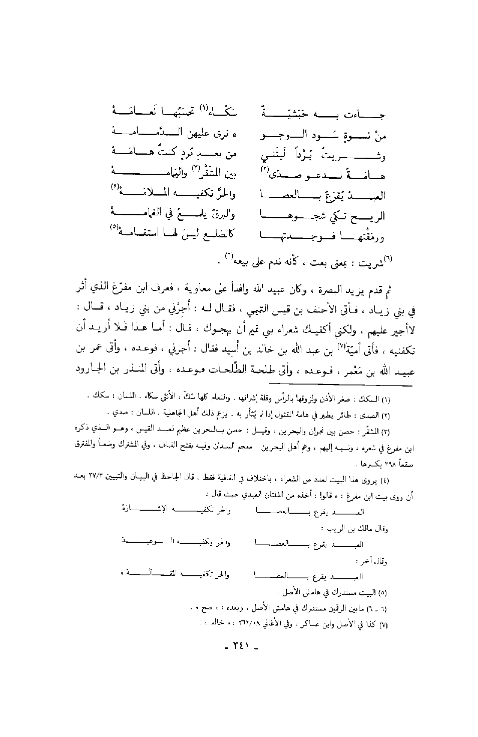 ثم قدم يزيد البصرة، وكان عبيد الله وافداً على معاوية، فعرف ابن مفرغ الذي أثر في بني زياد، فأتى الأحنف بن قيس التميمي، فقال له: أجرني من بني زياد، قال: لا أجير عليهم، ولكني أكفيك شعراء بني تميم أن يهجوك، قال: أما هذا فلا أريد أن تكفنيه، فأتى أمية بن عبد الله بن خالد بن أسيد فقال: أجرني، فوعده، وأتى عمر بن عبيد الله بن معمر، فوعده، وأتى طلحة الطلحات فوعده، وأتى المنذر بن الجارود