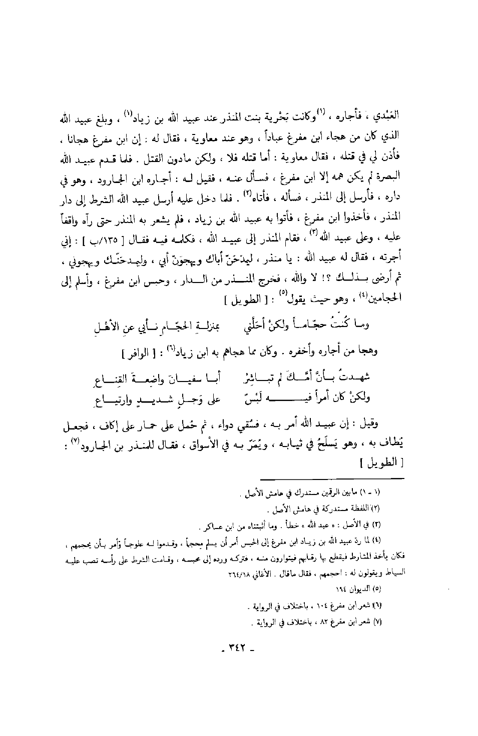 العبدي، فأجاره، وكانت بحرية بنت المنذر عند عبيد الله بن زياد، وبلغ عبيد الله الذي كان من هجاء ابن مفرغ عباداً، وهو عند معاوية، فقال له: إن ابن مفرغ هجاناً، فأذن لي في قتله، فقال معاوية: أما قتله فلا، ولكن ما دون القتل. فلما قدم عبيد الله البصرة لم يكن همه إلا ابن مفرغ، فسأل عنه، فقيل له: أجاره ابن الجارود، وهو في داره، فأرسل إلى المنذر، فسأله، فأتاه. فلما دخل عليه أرسل عبيد الله الشرط إلى دار المنذر، فأخذوا ابن مفرغ، فأتوا به عبيد الله بن زياد، فلم يشعر به المنذر حتى رآه واقفاً عليه، وعلى عبيد الله، فقام المنذر إلى عبيد الله، فكلمه فيه فقال: إني أجرته، فقال له عبيد الله: يا منذر، ليمدحن أباك ويهجون أبي، وليمدحنك ويهجوني، ثم أرضى بذلك؟! لا والله، فخرج المنذر من الدار، وحبس ابن مفرغ، وأسلم إلى الحجامين، وهو حيث يقول: