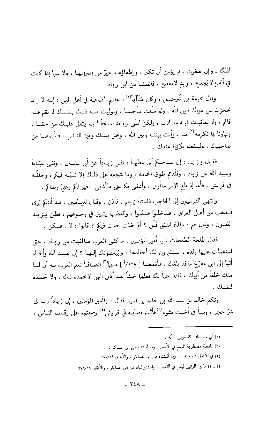 فقال طلحة الطلحات: يا أمير المؤمنين، ما كفى ما لقيت من زياد، حتى استعملت عليها ولده، يستثيرون لك أحقادها، ويبغضونك إليها؟ إن عبيد الله وأخاه أتيا إلى ابن مفرغ ما قد بلغك، فأنصفنا منهما إنصافاً تعلم العرب به أن لنا منك خلفاً من أبيك، فلقد خبأ لك فعلهما خبئاً عند أهل اليمن لا نحمده لك، ولا تحمده لنفسك. وتكلم خالد بن عبد الله بن خالد بن أسيد فقال: يا أمير المؤمنين، إن زياداً ربا في شر حجر، ونشأ في أخبث نشوء فأثبتم نصابه في قريش وحملتموه على رقاب الناس،