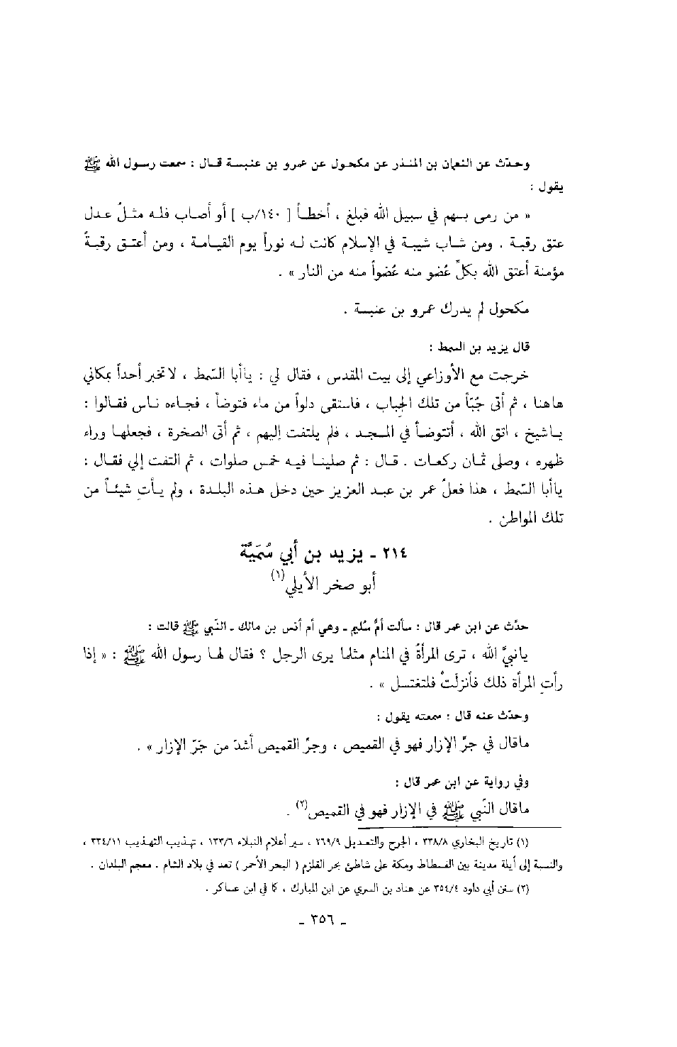 وحدث عن النعمان بن المنذر عن مكحول عن عمرو بن عنبسة قال: سمعت رسول الله صَلَّى اللهُ عَلَيْهِ وَسَلَّمَ يقول: " من رمى بسهم في سبيل الله فبلغ، أخطأ أو أصاب فله مثل عدل عتق رقبة. ومن شاب شيبة في الإسلام كانت له نوراً يوم القيامة، ومن أعتق رقبة مؤمنة أعتق الله بكل عضو منه عضواً منه من النار ".