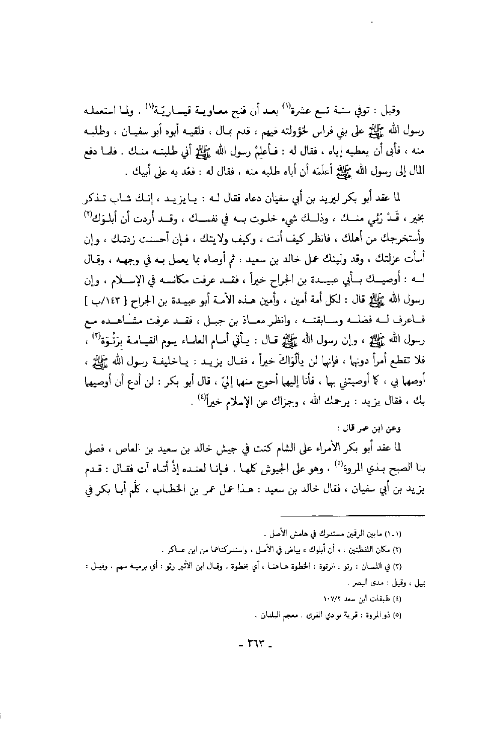 وعن ابن عمر قال: لما عقد أبو بكر الأمراء على الشام كنت في جيش خالد بن سعيد بن العاص، فصلى بنا الصبح بذي المروة، وهو على الجيوش كلها. فإنا لعنده غذ أتاه آت فقال: قدم يزيد بن أبي سفيان، فقال خالد بن سعيد: هذا عمل عمر بن الخطاب، كلم أبا بكر في