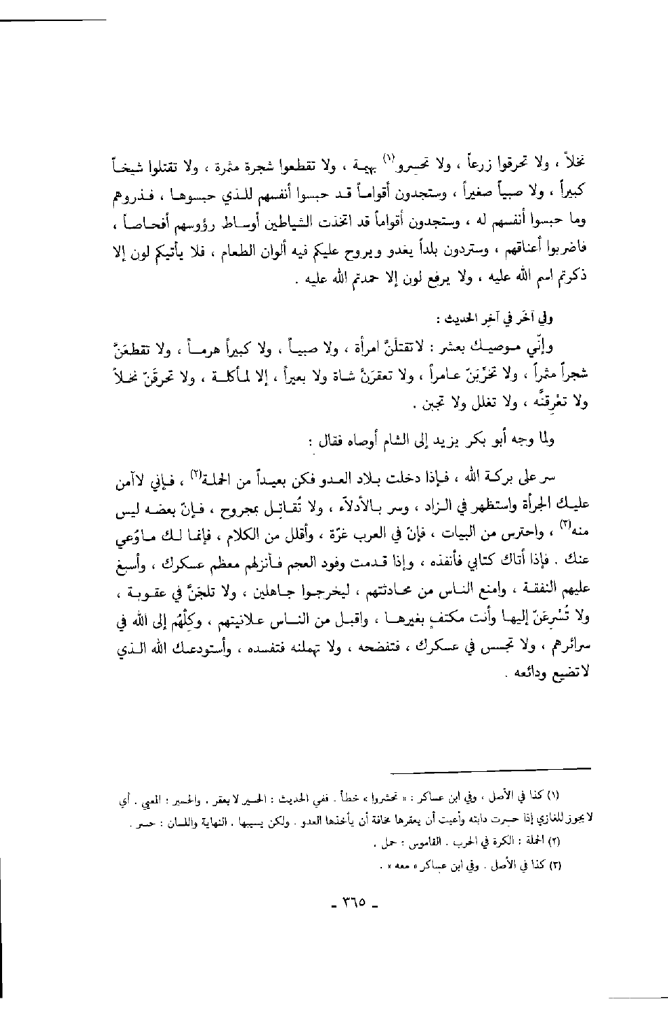 وفي آخر في آخر الحديث: وإني موصيك بعشر: لا تقتلن امرأة، ولا صبياً، ولا كبيراً هرماً، ولا تقطعن شجراً مثمراً، ولا تخربن عامراً، ولا تعقرن شاة ولا بعيراً، إلا لمأكلة، ولا تحرقن نخلاً ولا تعرقنه، ولا تغلل ولا تجبن.