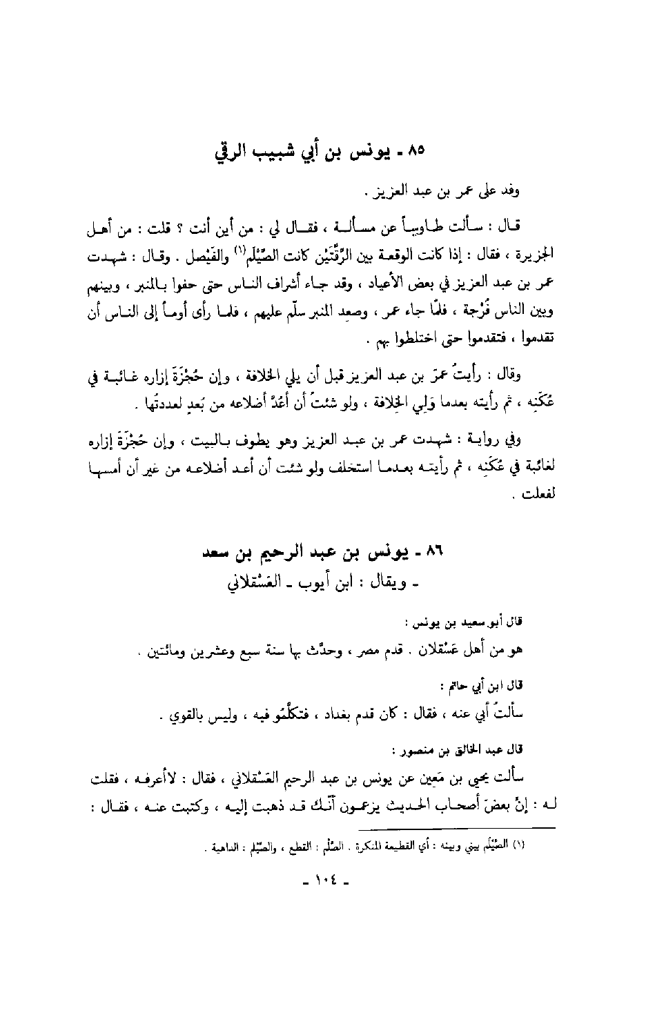 قال: سألت طاوساً عن مسألة، فقال لي: من أين أنت؟ قلت: من أهل الجزيرة، فقال: إذا كانت الوقعة بين الرقتين كانت الصيلم والفيصل. وقال: شهدت عمر بن عبد العزيز في بعض الأعياد، وقد جاء أشراف الناس حتى حفوا بالمنبر، وبينهم وبين الناس فرجة، فلما جاء عمر، وصعد المنبر سلم عليهم، فلما رأى أومأ إلى الناس أن تقدموا، فتقدموا حتى اختلطوا بهم.