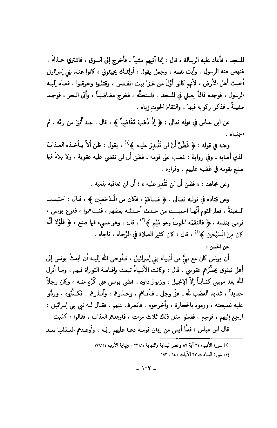 المسجد، فأعاد عليه الرسالة، قال: إنما آتيهم مشياً، فأخرج إلى السوق، فاشتري حذاءً. فنهض عنه الرسول. وأبت نفسه، وجعل يقول: أولئك يجيئوني، كانوا عند بني إسرائيل أخبث أهل الأرض، لأنهم كانوا أول من غزا بيت المقدس، وقتلوا وحرقوا. فعاد إليه الرسول، فوجده قائماً يصلي في المسجد. فاستحثه، فخرج مغاضباً، وأتى البحر، فوجد سفينةً فذكر ركوبه فيها، والتقام الحوت إياه.