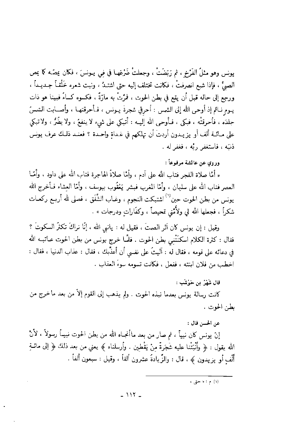 عن الحسن قال: إن يونس كان نبياً، ثم صار من بعد ما أنجاه الله من بطن الحوت نبياً رسولاً، لأن الله يقول: " وأَنْبَتْنا عليه شَجَرةً مِنْ يَقْطِين. وأرسلناه " يعني من بعد ذلك " إلى مائةِ أَلْفٍ أو يزيدون "، قال: والزيادة عشرون ألفاً، وقيل: سبعون ألفاً.
