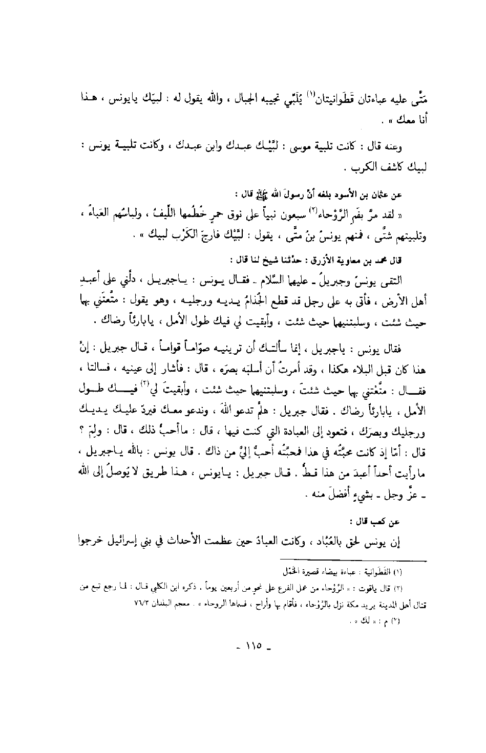 عن عثمان بن الأسود بلغه أن رسول الله صَلَّى اللهُ عَلَيْهِ وَسَلَّمَ قال: لقد مر بفم الروحاء سبعون نبياً على نوق حمر خطمها الليف، ولباسهم العباء، وتلبيتهم شتى، فمنهم يونس بن متى، يقول: لبيك فارج الكرب لبيك.