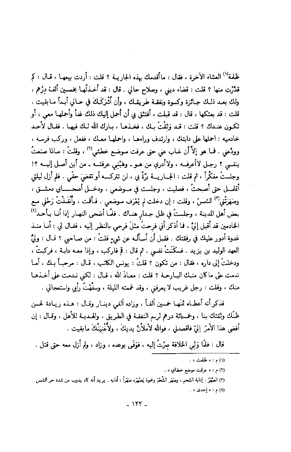 ظلمة العشاء الآخرة، فقال: ما أقدمك بهذه الجارية؟ قلت: أردت بيعها، قال: كم قدرت منها؟ قلت: قضاء ديني، وصلاح حالي. قال: قد أخذتها بخمسين ألف درهم، ولك بعد ذلك جائزة وكسوة ونفقة طريقك، وأن أشركك في حالي أبداً ما بقيت. قلت: قد بعتكها، قال: قد قبلت، أفتثق بي أن أحمل إليك ذلك غداً وأحملها معي، أو تكون عندك؟ قلت: قد وثقت بك، فخذها، بارك الله لك فيها. فقال لأحد خادميه: احملها على دابتك، وارتدف وراءها، واحملها معك، ففعل، وركب فرسه، وودعني. فما هو إلا أن غاب عني حتى عرفت موضع خطئي، وقلت: ماذا صنعت بنفسي؟ رجل لا أعرفه، ولا أدري من هو وهبني عرفته من أين أصل إليه؟! وجلست مفكراً، ثم قلت: الجارية برة بي، لن تتركه أو تقضي حقي. فلم أزل ليلتي أتململ حتى أصبحت، فصليت، وجلست في موضعي، ودخل أصحابي دمشق، وصهرتني الشمس، وقلت: إن دخلت لم يعرف موضعي، فأقمت، وأنفذت رحلي مع بعض أهل المدينة، وجلس في ظل جدار هناك. فلما أضحى النهار إذا أنا بأحد الخادمين قد أقبل إلي، فما أذكر أني فرحت مثل فرحي بالنظر إليه، فقال لي: أنا منذ غدوة أدور عليك في رفقتك. فقبل أن أسأله عن شيء قلت: من صاحبي؟ قال: ولي العهد الوليد بن يزيد. فسكنت نفسي. ثم قال: قم فاركب، وإذا معه دابة، فركبت، ودخلت إلى داره، فقال: من تكون؟ قلت: يونس الكاتب، قال: مرحباً بك، أما ندمت على ما كان منك البارحة؟ قلت: معاذ الله، قال: لكني ندمت على أخذها منك، وقلت: رجل غريب لا يعرفني، وقد غممته الليلة، وسفهت رأيي واستعجالي.