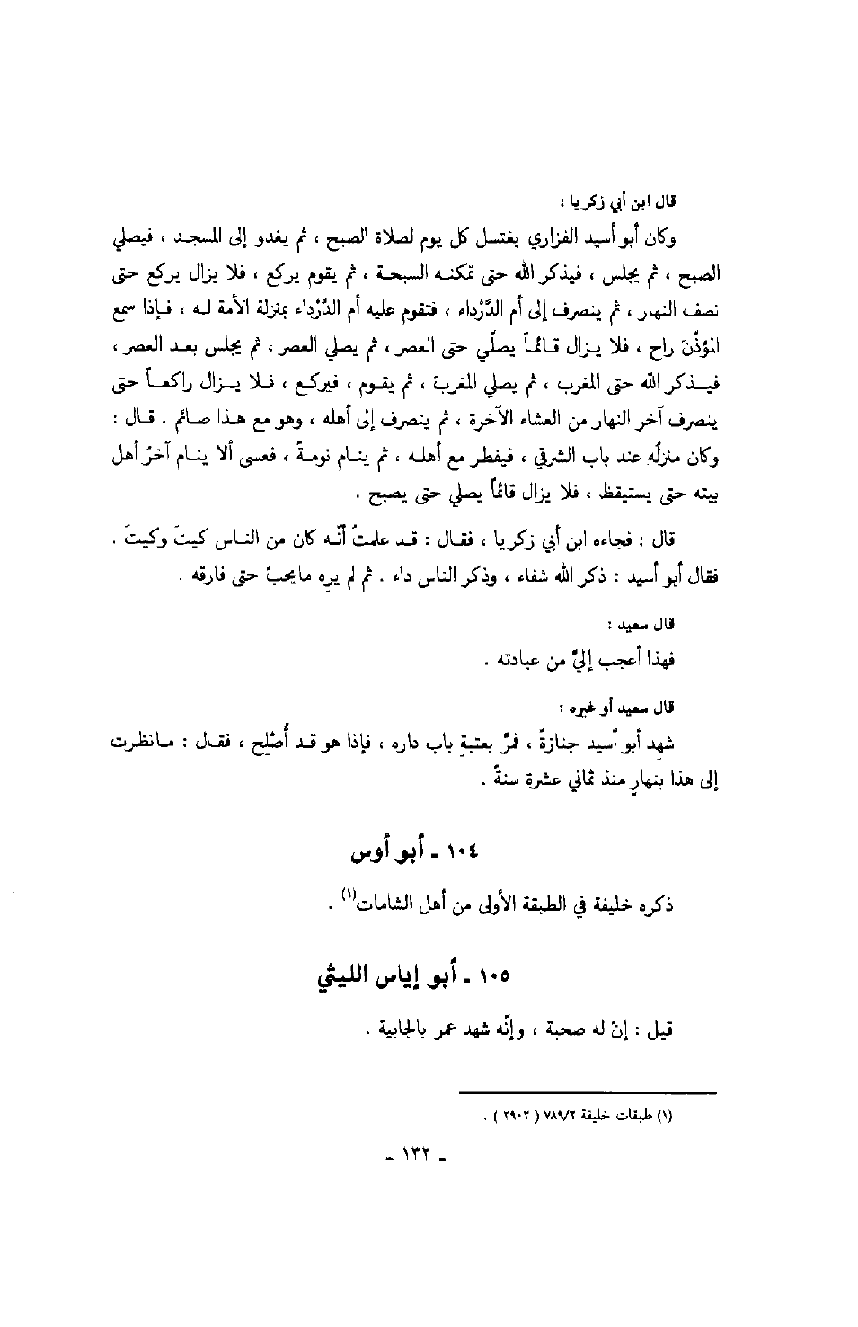 قال ابن أبي زكريا: وكان أبو أسيد الفزاري يغتسل كل يوم لصلاة الصبح، ثم يغدو إلى المسجد، فيصلي الصبح، ثم يجلس، فيذكر الله حتى تمكنه السبحة، ثم يقوم يركع، فلا يزال يركع حتى نصف النهار، ثم ينصرف إلى أم الدرداء، فتقوم عليه أم الدرداء بمنزلة الأمة له، فإذا سمع المؤذن راح، فلا يزال قائماً يصلي حتى العصر، ثم يصلي العصر، ثم يجلس بعد العصر، فيذكر لله حتى المغرب، ثم يصلي المغرب، ثم يقوم، فيركع، فلا يزال راكعاً حتى ينصرف آخر النهار من العشاء الآخرة، ثم ينصرف إلى أهله، وهو مع هذا صائم. قال: وكان منزله عند باب الشرقي، فيفطر مع أهله، ثم ينام نومة، فعسى ألا ينام آخر أهل بيته حتى يستيقظ، فلا يزال قائماً يصلي حتى يصبح.