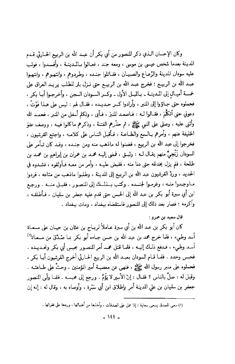 قال سعيد بن عمرو: كان أبو بكر بن عبد الله بن أبي سبرة عاملاً لرباح بن عثمان بن حيان على مسعاة أسد وطيء، فلما خرج محمد بن عبد الله بن حسن جاءه أبو بكر بما صدق من مسعاه أسد وطيء، فدفع ذلك إليه، فلما قتل محمد أمر المنصور بحبس أبي بكر وتحديده. فحبس وحدد. فلما قام السودان بعبد الله بن الربيع الحارثي أخرج القرشيون أبا بكر، فحملوه على منبر رسول الله صَلَّى اللهُ عَلَيْهِ وَسَلَّمَ، فنهى عن معصية أمير المؤمنين، وحث على طاعته. وقيل له: صل بالناس؟ فقال: إن الأسير لا يؤم. ورجع إلى محبسه. فلما ولى المنصور جعفر بن سليمان بن علي المدينة أمر بإطلاق ابن أبي سبرة، وأوصاه به، وقال له: إنه إن
