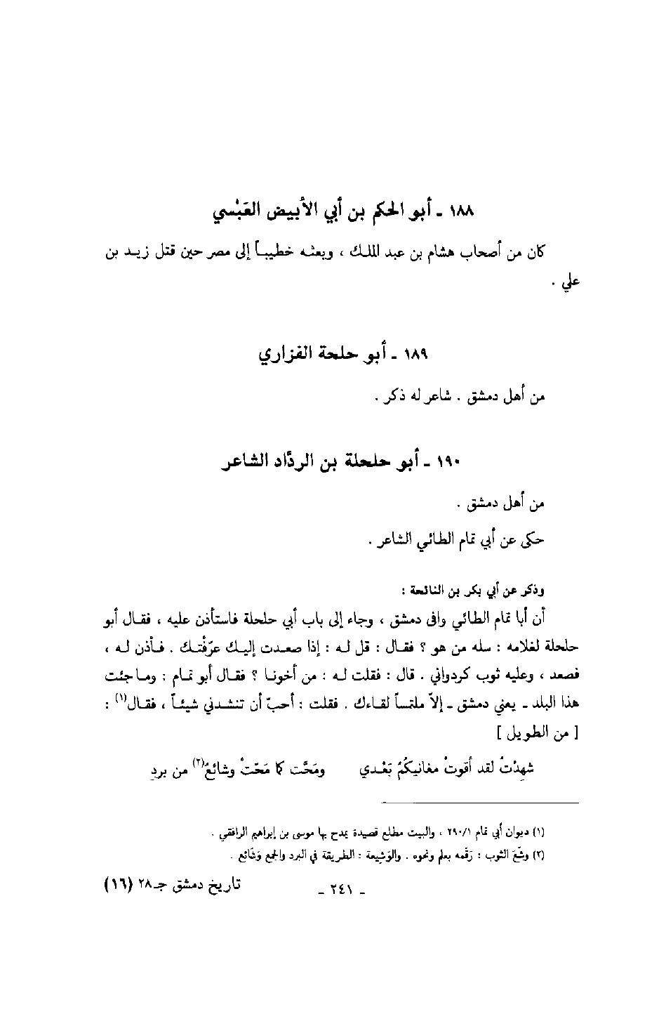 وذكر عن أبي بكر بن النائحة: أن أبا تمام الطائي وافى دمشق، وجاء إلى باب أبي حلحلة فاستأذن عليه، فقال أبو حلحلة لغلامه: سله من هو؟ فقال: قل له: إذا صعدت إليك عرفتك. فأذن له، فصعد، وعليه ثوب كردواني. قال: فقلت له: من أخونا؟ فقال أبو تمام: وما جئت هذا البلد يعني دمشق إلا ملتمساً لقاءك. فقلت: أحب أن تنشدني شيئاً، فقال: من الطويل
