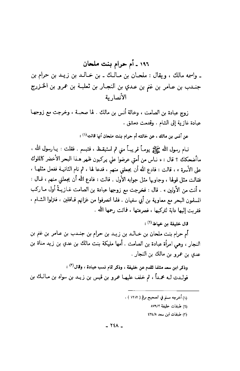 عن أنس بن مالك، عن خالته أم حرام بنت ملحان أنها قالت: نام رسول الله صَلَّى اللهُ عَلَيْهِ وَسَلَّمَ يوماً قريباً مني ثم استيقظ، فتبسم. فقلت: يا رسول الله، ما أضحكك؟ قال: ناس من أمتي عرضوا علي يركبون ظهر هذا البحر الأخضر كالملوك على الأسرة، قالت: فادع الله أن يجعلني منهم، فدعا لها، ثم نام الثانية ففعل مثلها، فقالت مثل قولها، وجاوبها مثل جوابه الأول. قالت: فادع الله أن يجعلني منهم، قال: أنت من الأولين. قال: فخرجت مع زوجها عبادة بن الصامت غازيةً أول ما ركب المسلمون البحر مع معاوية بن أبي سفيان. فلما انصرفوا من غزاتهم قافلين، فنزلوا الشام، فقربت إليها دابة لتركبها، فصرعتها، فماتت رحمها الله.