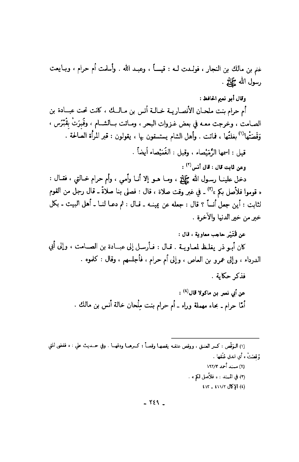عن أبي نصر بن ماكولا قال: أما حرام بحاء مهملة وراء أم حرام بنت ملحان خالة أنس بن مالك.