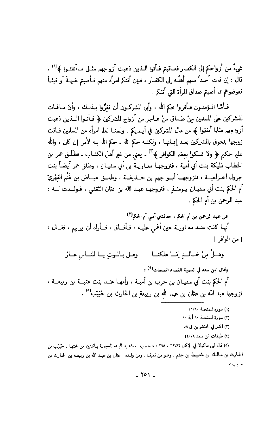 فأما المؤمنون فأقروا بحكم الله، وأبى المشركون أن يقروا بذلك، وأن ما فات للمشركين على المسلمين من صداق من هاجر من أزواج المشركين " فآتوا الذين ذهبت أزواجهم مثلما أنفقوا " من مال المشركين في أيديكم. ولسنا نعلم امرأة من المسلمين فاتت زوجها بلحوق بالمشركين بعد إيمانها، ولكنه حكم الله، حكم الله به لأمر إن كان، والله عليم حكيم " ولا تمسكوا بعِصَم الكوافر " يعني من غير أهل الكتاب فطلق عمر بن الخطاب مليكة بنت أبي أمية، فتزوجها معاوية بن أبي سفيان، وطلق عمر أيضاً بنت جرول الخزاعية، فتزوجها أبو جهم بن حذيفة، وطلق عياض بن غنم الفهري أم الحكم بنت أبي سفيان يومئذ، فتزوجها عبد الله بن عثمان الثقفي، فولدت له: عبد الرحمن بن أم الحكم.