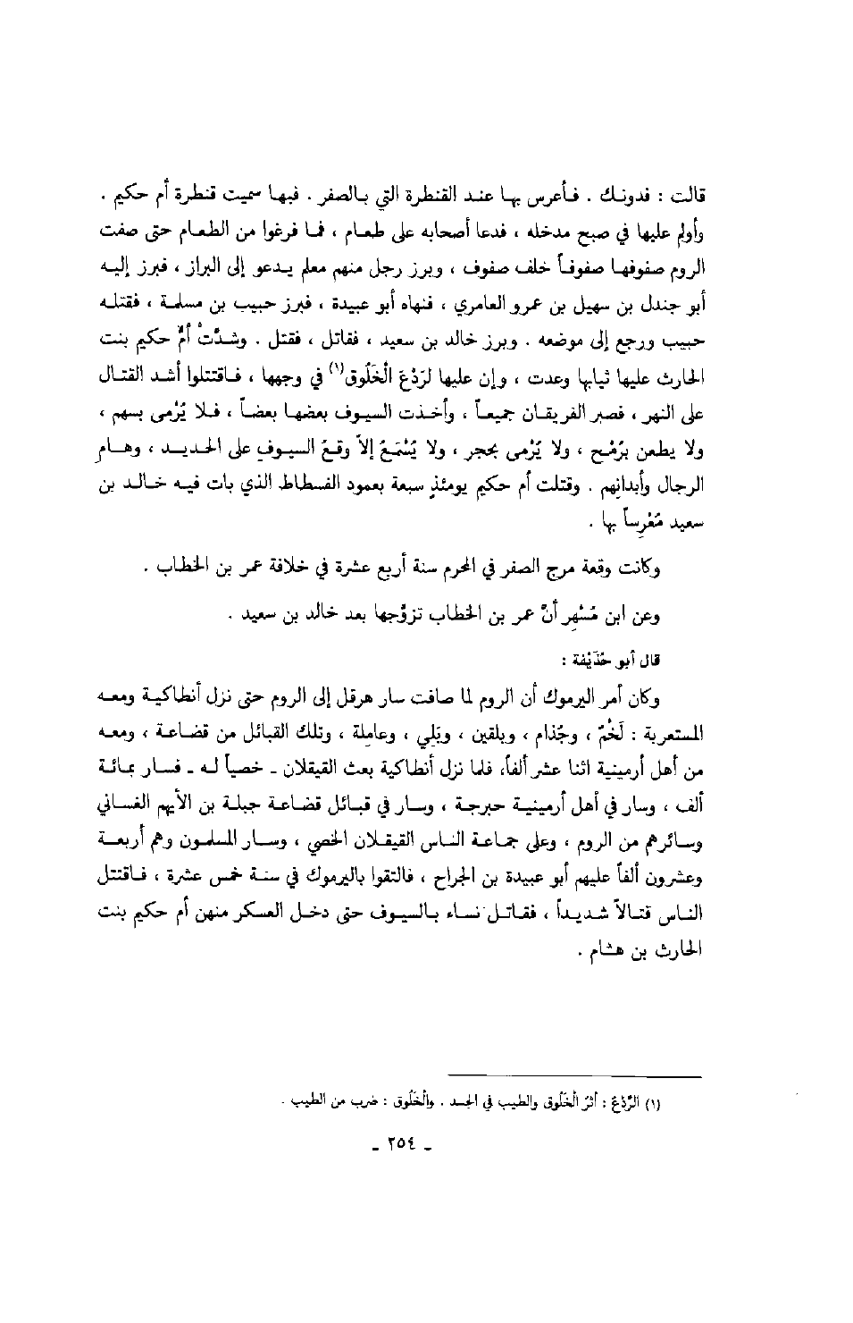 قالت: فدونك. فأعرس بها عند القنطرة التي بالصفر. فبها سميت قنطرة أم حكيم. وأولم عليها في صح مدخله، فدعا أصحابه على طعام، فما فرغوا من الطعام حتى صفت الروم صفوفها صفوفاً خلف صفوف، وبرز رجل منهم معلم يدعو إلى البراز، فبرز إليه أبو جندل بن سهيل بن عمرو العامري، فنهاه أبو عبيدة، فبرز حبيب بن مسلمة، فقتله حبيب ورجع إلى موضعه. وبرز خالد بن سعيد، فقالت، فقتل. وشدت أم حكيم بنت الحارث عليها ثيابها وعدت، وإن عليها لردع الخلوق في وجهها، فاقتتلوا أشد القتال على النهر، فصبر الفريقان جميعاً، وأخذت السيوف بعضها بعضاً، فلا يرمى بسهم، ولا يطعن برمح، ولا يرمى بحجر، ولا يسمع إلا وقع السيوف على الحديد، وهام الرجال وأبدانهم. وقتلت أم حكيم يومئذ سبعة بعمود الفسطاط الذي بات فيه خالد بن سعيد معرساً بها.