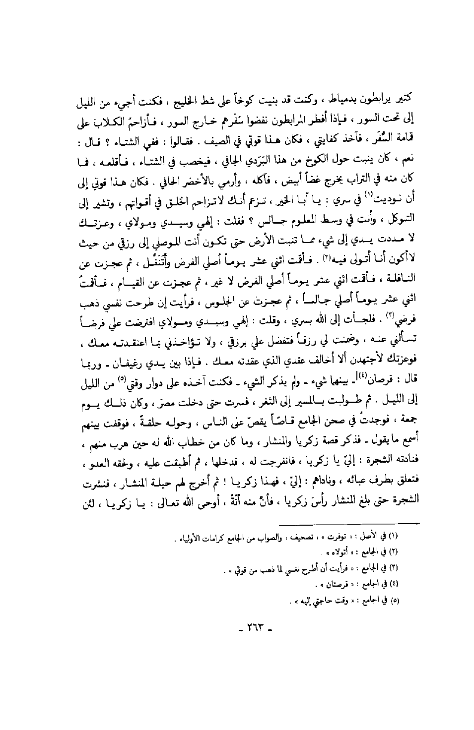 كثير يرابطون بدمياط، وكنت قد بنيت كوخاً على شط الخليج، فكنت أجيء من الليل إلى تحت السور، فإذا أفطر المرابطون نفضوا سفرهم خارج السور، فأزاحم الكلاب على قمامة السفر، فآخذ كفايتي، فكان هذا قوتي في الصيف. فقالوا: ففي الشتاء؟ قال: نعم، كان ينبت حول الكوخ من هذا البردي الجافي، فيخصب في الشتاء، فأقلعه، فما كان منه في التراب يخرج غضاً أبيض، فآكله، وأرمي بالأخضر الجافي. فكان هذا قوتي إلى أن نوديت في سري: يا أبا الخير، تزعم أنك لا تزاحم الخلق في أقواتهم، وتشير إلى التوكل، وأنت في وسط المعلوم جالس؟ فقلت: إلهي وسيدي ومولاي، وعزتك لا مددت يدي إلى شيء مما تنبت الأرض حتى تكون أنت الموصلي إلى رزقي من حيث لا أكون أنا أتولى فيه. فأقمت اثني عشر يوماً أصلي الفرض وأتنفل، ثم عجزت عن النافلة، فأقمت اثني عشر يوماً أصلي الفرض لا غير، ثم عجزت عن القيام، فأقمت اثني عشر يوماً أصلي جالساً، ثم عجزت عن الجلوس، فرأيت إن طرحت نفسي ذهب فرضي. فلجأت إلى الله بسري، وقلت: إلهي وسيدي ومولاي افترضت علي فرضاً تسألني عنه، وضمنت لي رزقاً فتفضل علي برزقي، ولا تؤاخذني بما اعتقدته معك، فوعزتك لأجتهدن ألا أخالف عقدي الذي عقدته معك. فإذا بين يدي رغيفان وربما قال: قرصان بينهما شيء ولم يذكر الشيء فكنت آخذه على دوار وقتي من الليل إلى الليل. ثم طولبت بالمسير إلى الثغر، فسرت حتى دخلت مصر، وكان ذلك يوم جمعة، فوجدت في صحن الجامع قاصاً يقص على الناس، وحوله حلقة، فوقفت بينهم أسمع ما يقول فذكر قصة زكريا والمنشار، وما كان من خطاب الله له حين هرب منهم، فنادته الشجرة: إلي يا زكريا، فانفرجت له، فدخلها، ثم أطبقت عليه، ولحقه العدو، فتعلق بطرف عبائه، وناداهم: إلي، فهذا زكريا! ثم أخرج لهم حيلة المنشار، فنشرت الشجرة حتى بلغ المنشار رأس زكريا، فأن منه أنةً، أوحى الله تعالى: يا زكريا، لئن