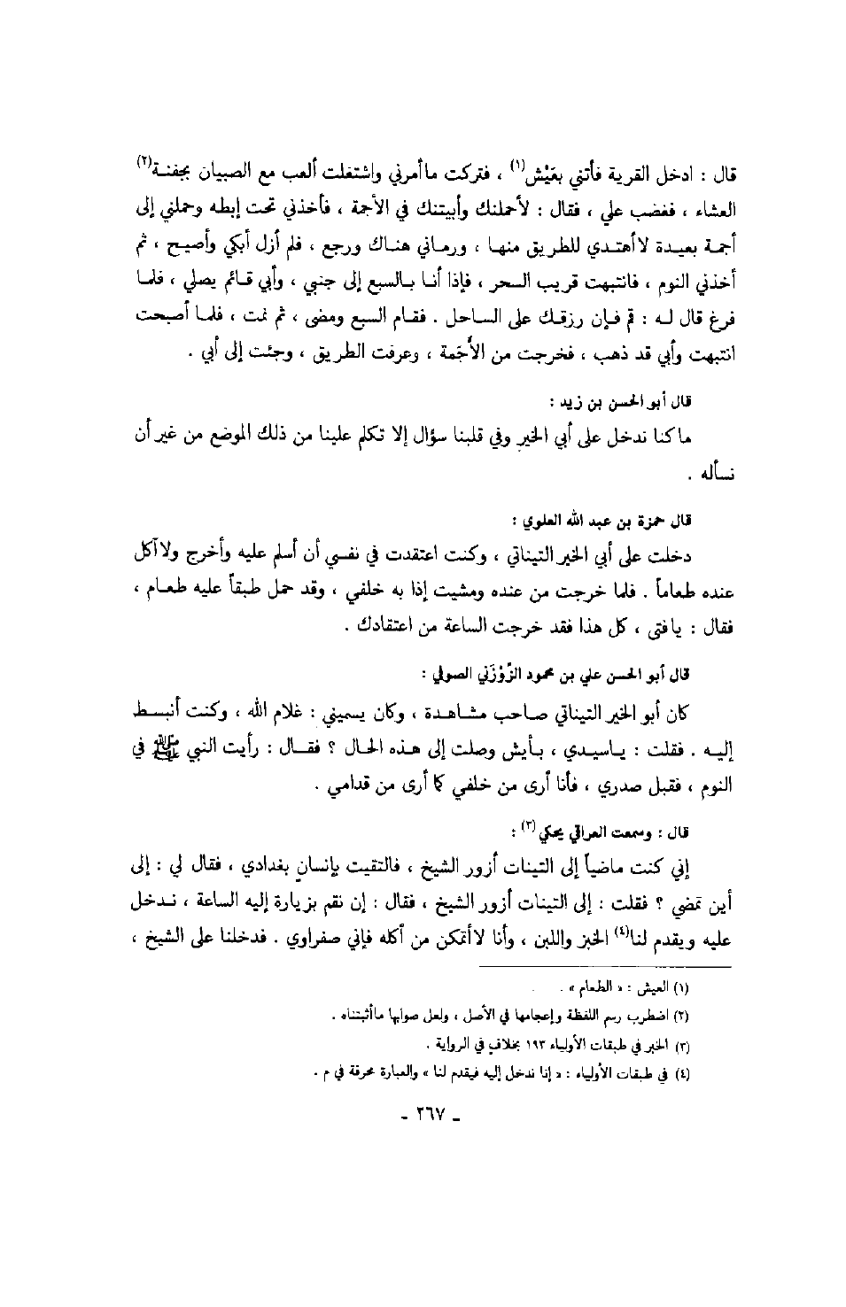 قال: وسمعت العراقي يحكي: إني كنت ماضياً إلى التينات أزور الشيخ، فالتقيت بإنسان بغدادي، فقال لي: إلى أين تمضي؟ فقلت: إلى التينات أزور الشيخ، فقال: إن نقم بزيارة إليه الساعة، ندخل عليه ويقدم لنا الخبز واللبن، وأنا لا أتمكن من أكله فإني صفراوي. فدخلنا على الشيخ،