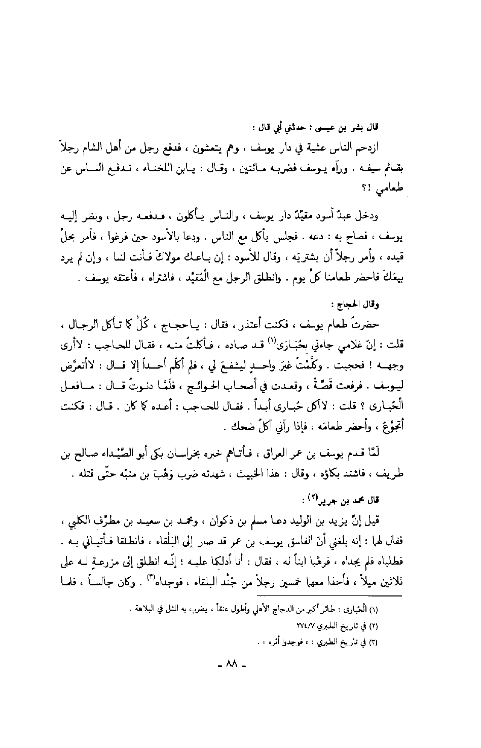 وقال الحجاج: حضرت طعام يوسف، فكنت أعتذر، فقال: يا حجاج، كل كما تأكل الرجال، قلت: إن غلامي جاءني بحبارى قد صاده، فأكلت منه، فقال للحاجب: لا أرى وجهه! فحجبت. وكلمت غير واحد ليشفع لي، فلم أكلم أحداً إلا قال: لا أتعرض ليوسف. فرفعت قصةً، وقعدت في أصحاب الحوائج، فلما دنوت قال: ما فعل الحبارى؟ قلت: لا آكل حبارى أبداً. فقال للحاجب: أعده كما كان. قال: فكنت أتجوع، وأحضر طعامه، فإذا رآني آكل ضحك.