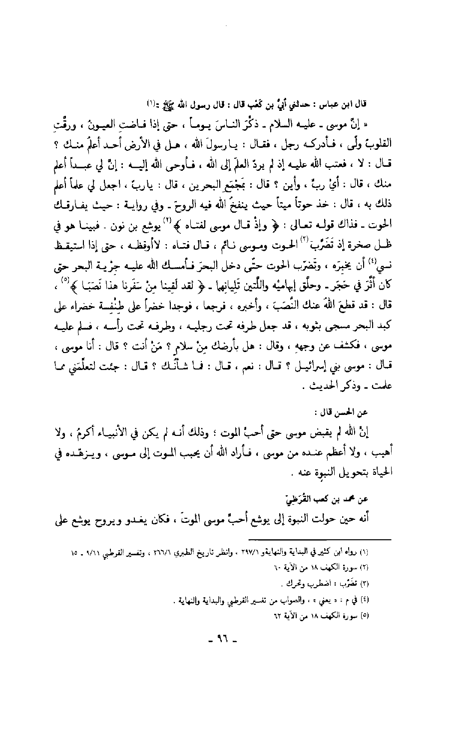 قال ابن عباس: حدثني أبي بن كعب قال: قال رسول الله صَلَّى اللهُ عَلَيْهِ وَسَلَّمَ: إن موسى عليه السلام ذكر الناس يوماً، حتى إذا فاضت العيون، ورقت القلوب ولى، فأدركه رجل، فقال: يا رسول الله، هل في الأرض أحد أعلم منك؟ قال: لا، فعتب الله عليه إذ لم يرد العلم إلى الله، فأوحى الله إليه: إن لي عبداً أعلم منك، قال: أي رب، وأين؟ قال: بمجمع البحرين، قال: يا رب، اجعل لي علماً أعلم ذلك به، قال: خذ حوتاً ميتاً حيث ينفخ الله فيه الروح وفي رواية: حيث يفارقك الحوت فذاك قوله تعالى: " وإذْ قال موسى لفتاه " يوشع بن نون. فبينا هو في ظل صخرة إذ تضرب الحوت وموسى نائم، قال فتاه: لا أوقظه، حتى إذا استيقظ نسي أن يخبره، وتضرب الحوت حتى دخل البحر فأمسك الله عليه جرية البحر حتى كان أثر في حجر وحلق إبهاميه واللتين تليانهما " لقد لَقِينا مِنْ سَفَرنا هذا نَصَبَا "، قال: قد قطع الله عنك النصب، وأخبره، فرجعا، فوجدا خضراً على طنفسة خضراء على كبد البحر مسجى بثوبه، قد جعل طرفه تحت رجليه، وطرفه تحت رأسه، فسلم عليه موسى، فكشف عن وجهه، وقال: هل بأرضك من سلام؟ من أنت؟ قال: أنا موسى، قال: موسى بني إسرائيل؟ قال: نعم، قال: فما شأنك؟ قال: جئت لتعلمني مما علمت وذكر الحديث.
