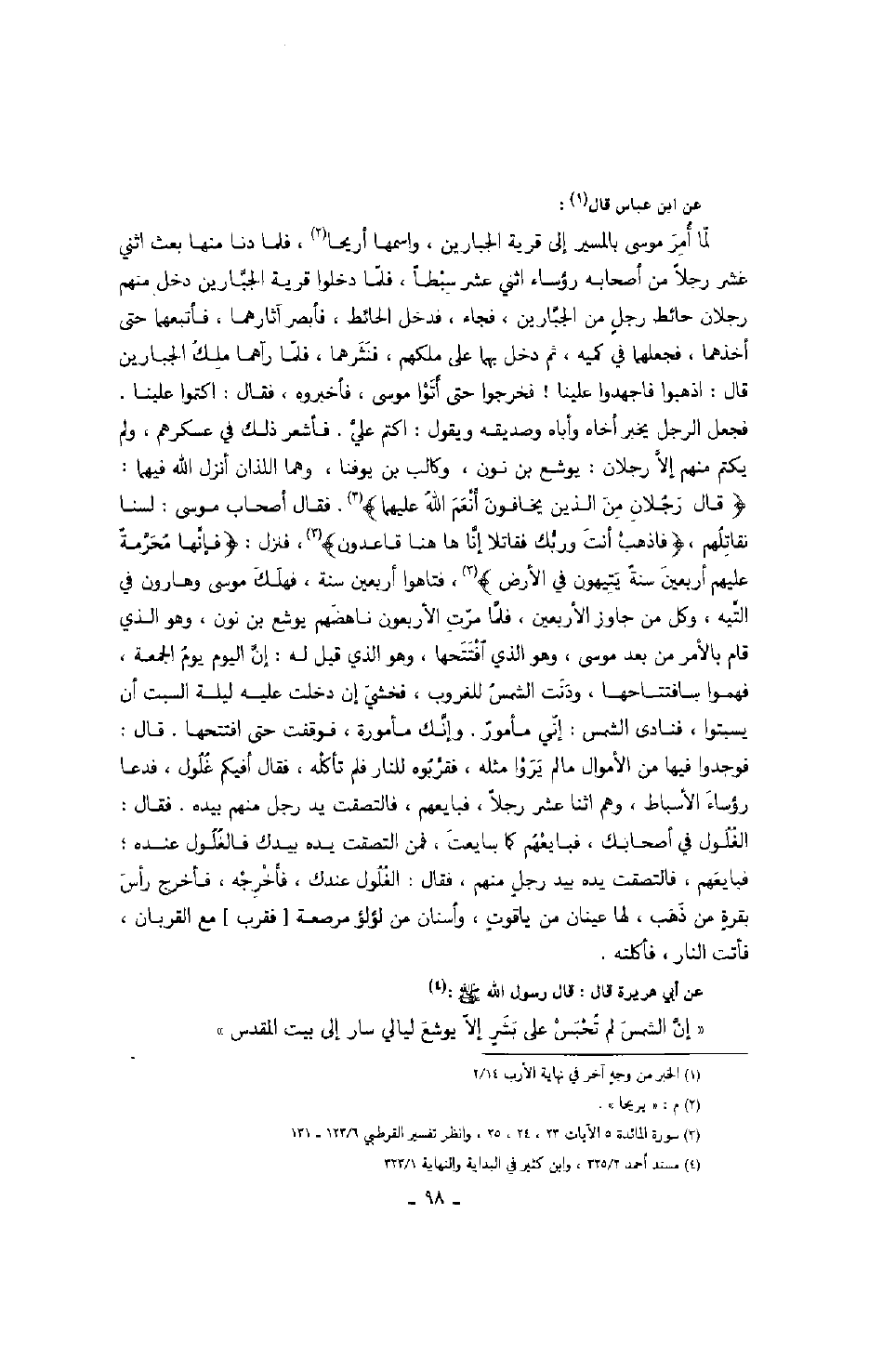 عن ابن عباس قال: لما أمر موسى بالمسير إلى قرية الجبارين، واسمها أريحا، فلما دنا منها بعث اثني عشر رجلاً من أصحابه رؤساء اثني عشر سبطاً، فلما دخلوا قرية الجبارين دخل منهم رجلان حائط رجل من الجبارين، فجاء، فدخل الحائط، فأبصر آثارهما، فأتبعهما حتى أخذهما، فجعلهما في كميه، ثم دخل بهما على ملكهم، فنثرهما، فلما رآهما ملك الجبارين قال: اذهبوا فاجهدوا علينا! فخرجوا حتى أتوا موسى، فأخبروه، فقال: اكتموا علينا. فجعل الرجل يخبر أخاه وأباه وصديقه ويقول: اكتم علي. فأشعر ذلك في عسكرهم، ولم يكتم منهم إلا رجلان: يوشع بن نون، وكالب بن يوفنا، وهما اللذان أنزل الله فيهما: " قال رَجُلانِ مِنَ الذين يخافونَ أَنْعَمَ اللهُ عليهما ". فقال أصحاب موسى: لسنا نقاتلهم، " فاذهبْ أنتَ وربُّك فقاتلا إنَّا ها هنا قاعدون "، فنزل: " فإنَّها مُحَرَّمةٌ عليهم أربعينَ سنةً يَتِيهون في الأرض "، فتاهوا أربعين سنة، فهلك موسى وهارون في التيه، وكل من جاوز الأربعين، فلما مرت الأربعون ناهضهم يوشع بن نون، وهو الذي قام بالأمر من بعد موسى، وهو الذي أفتتحها، وهو الذي قيل له: إن اليوم يوم الجمعة، فهموا بافتتاحها، ودنت الشمس للغروب، فخشي إن دخلت عليه ليلة السبت أن يسبتوا، فنادى الشمس: إني مأمور. وإنك مأمورة، فوقفت حتى افتتحها. قال: فوجدوا فيها من الأموال ما لم يروا مثله، فقربوه للنار فلم تأكله، فقال أفيكم غلول، فدعا رؤساء الأسباط، وهم اثنا عشر رجلاً، فبايعهم، فالتصقت يد رجل منهم بيده. فقال: الغلول في أصحابك، فبايعهم كما بايعت، فمن التصقت يده بيدك فالغلول عنده؛ فبايعهم، فالتصقت يده بيد رجل منهم، فقال: الغلول عندك، فأخرجه، فأخرج رأس بقرة من ذهب، لها عينان من ياقوت، وأسنان من لؤلؤ مرصعة فقرب مع القربان، فأتت النار، فأكلته.