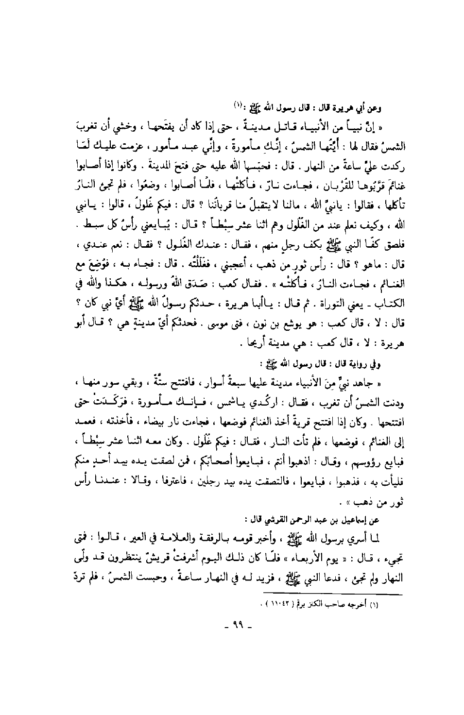 إن نبياً من الأنبياء قاتل مدينةً، حتى إذا كاد أن يفتحها، وخشي أن تغرب الشمس فقال لها: أيتها الشمس، إنك مأمورة، وإني عبد مأمور، عزمت عليك لما ركدت علي ساعةً من النهار. قال: فحبسها الله عليه حتى فتح المدينة. وكانوا إذا أصابوا غنائم قربوها للقربان، فجاءت نار، فأكلتها، فلما أصابوا، وضعوا، فلم تجئ النار تأكلها، فقالوا: يا نبي الله، مالنا لا يتقبل منا قرباننا؟ قال: فيكم غلول، قالوا: يا نبي الله، وكيف نعلم عند من الغلول وهم اثنا عشر سبطاً؟ قال: يبايعني رأس كل سبط. فلصق كفا النبي صَلَّى اللهُ عَلَيْهِ وَسَلَّمَ بكف رجل منهم، فقال: عندك الغلول؟ فقال: نعم عندي، قال: ما هو؟ قال: رأس ثور من ذهب، أعجبني، فغللته. قال: فجاء به، فوضع مع الغنائم، فجاءت النار، فأكلته. فقال كعب: صدق الله ورسوله، هكذا والله في الكتاب يعني التوراة. ثم قال: يا أبا هريرة، حدثكم رسول الله صَلَّى اللهُ عَلَيْهِ وَسَلَّمَ أي نبي كان؟ قال: لا، قال كعب: هو يوشع بن نون، فتى موسى. فحدثكم أي مدينة هي؟ قال أبو هريرة: لا، قال كعب: هي مدينة أريحا.