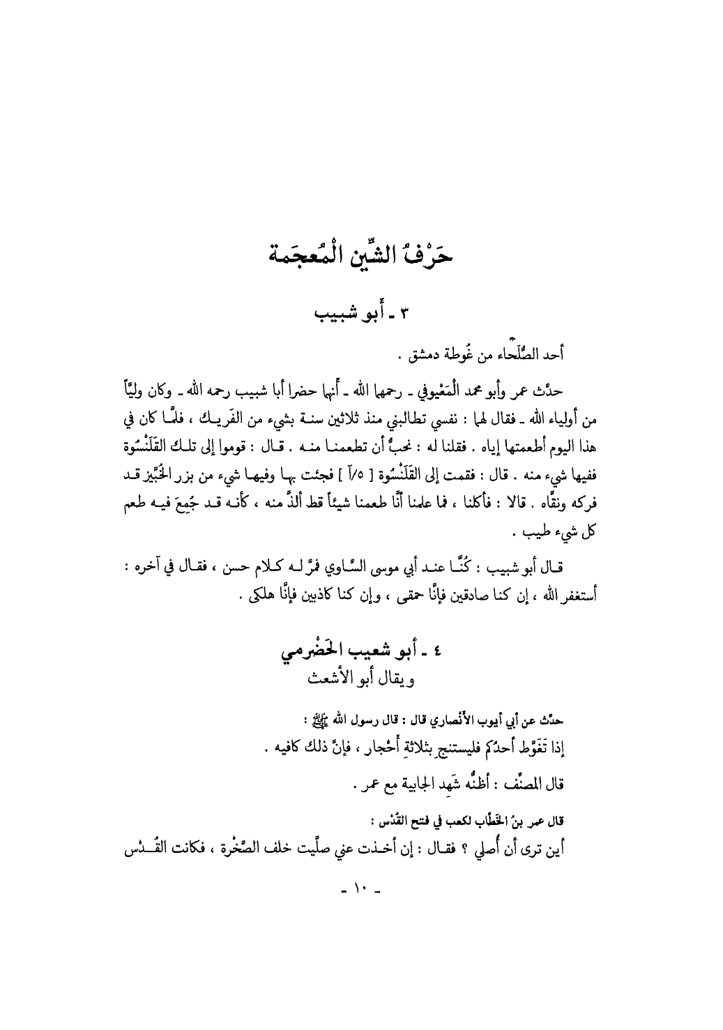 أحد الصلحاء من غوطة دمشق. حدث عمر وأبو محمد المعيوفي رحمهما الله أنهما حضرا أبا شبيب رحمه الله وكان ولياً من أولياء الله فقال لهما: نفسي تطالبني منذ ثلاثين سنة بشيء من الفريك، فلما كان في هذا اليوم أطعمتها إياه. فقلنا له: نحب أن تطعمنا منه. قال: قوموا إلى تلك القلنسوة ففيها شيء منه. قال: فقمت إلى القلنسوة فجئت بها وفيها شيء من بزر الخبيز قد فركه ونقاه. قالا: فأكلنا، فما علمنا أنا طعمنا شيئاً قط ألذ منه، كأنه قد جمع فيه طعم كل شيء طيب. قال أبو شبيب: كنا عند أبي موسى الساوي فمر له كلام حسن، فقال في آخره: أستغفر الله، إن كنا صادقين فإنا حمقى، وإن كنا كاذبين فإنا هلكى.