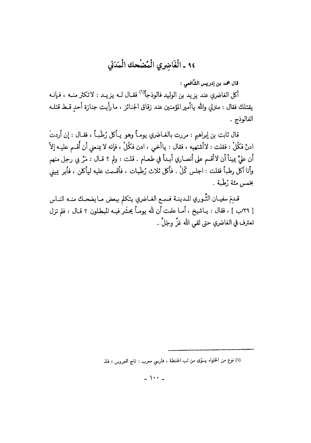 قال محمد بن إدريس الشافعي: أكل الغاضري عند يزيد بن الوليد فالوذجاً فقال له يزيد: لا تكثر منه، فإنه يقتلك فقال: منزلي والله يا أمير المؤمنين عند زقاق الجنائز، ما رأيت جنازة أحد قط قتله الفالوذج. قال ثابت بن إبراهيم: مررت بالغاضري يوماً وهو يأكل رطباً، فقال: إن أردت ادن فكل: فقلت: لا أشتهيه، فقال: يا أخي، ادن فكل، فإنه لا يمنعني أن أقسم عليه إلا أن علي يميناً أن لا أقسم على أنصاري أبداً في طعام. قلت: ولم؟ قال: مر بي رجل منهم وأنا آكل رطباً فقلت: اجلس كل. فأكل ثلاث رطبات، فأقسمت عليه ليأكلن، فأبر يميني بخمس مئة رطبة. قدم سفيان الثوري المدينة فسمع الغاضري يتكلم ببعض ما يضحك منه الناس فقال: يا شيخ، أما علمت أن لله يوماً يحشر فيه المبطلون؟ قال: فلم تزل تعترف في الغاضري حتى لقي الله عز وجل.