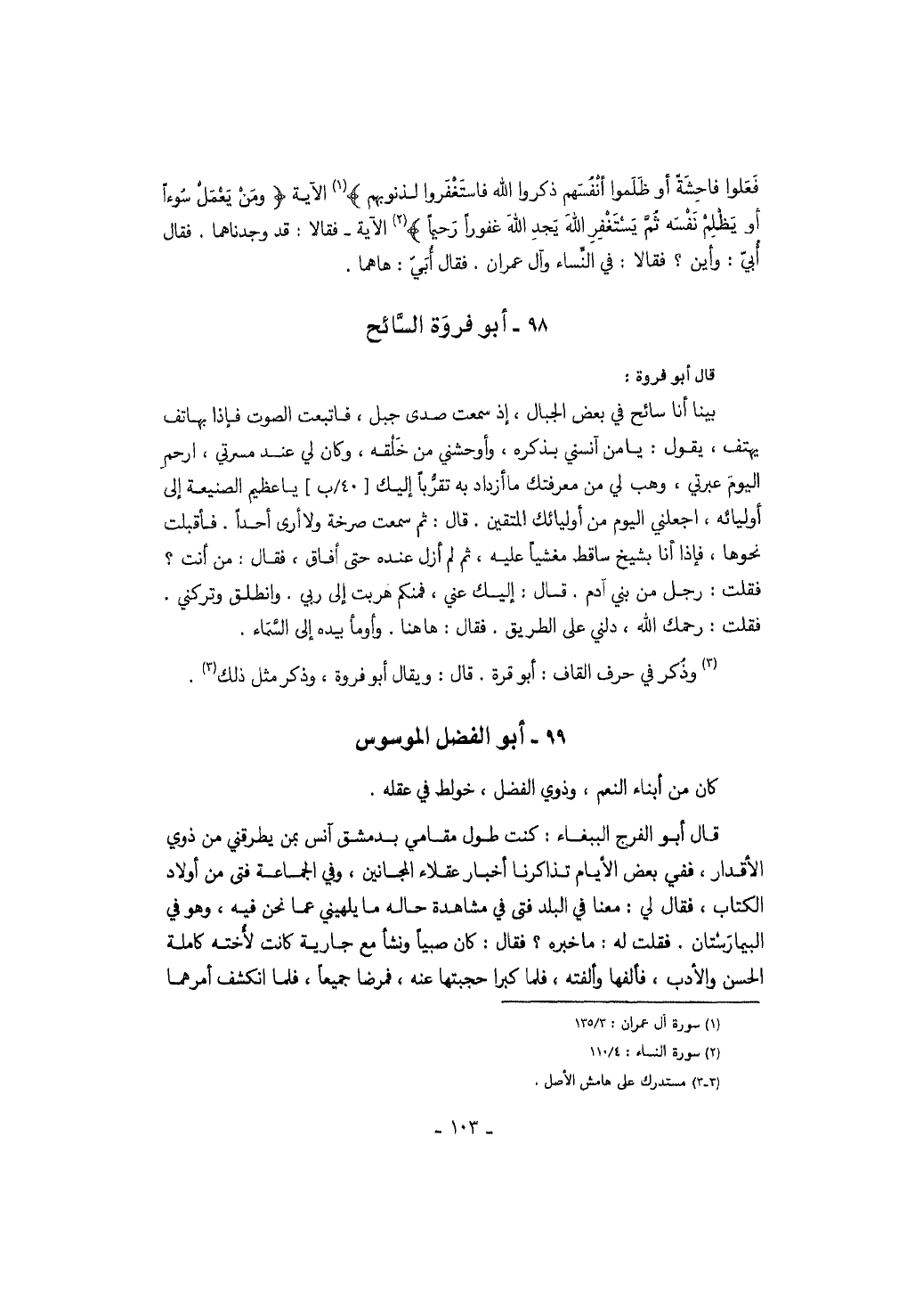 قال أبو فروة: بينا أنا سائح في بعض الجبال، إذ سمعت صدى جبل، فاتبعت الصوت فإذا بهاتف يهتف، يقول: يا من آنسني بذكره، وأوحشني من خلقه، وكان لي عند مسرتي، ارحم اليوم عبرتي، وهب لي من معرفتك ما أزداد به تقرباً إليك يا عظيم الصنيعة إلى أوليائه، اجعلني اليوم من أوليائك المتقين. قال: ثم سمعت صرخة ولا أرى أحداً. فأقبلت نحوها، فإذا أنا بشيخ ساقط مغشياً عليه، ثم لم أزل عنده حتى أفاق، فقال: من أنت؟ فقلت: رجل من بني آدم. قال: إليك عني، فمنكم هربت إلى ربي. وانطلق وتركني. فقلت: رحمك الله، دلني على الطريق. فقال: ها هنا. وأومأ بيده إلى السماء. وذكر في حف القاف: أبو قرة. قال: ويقال أبو فروة، وذكر مثل ذلك.