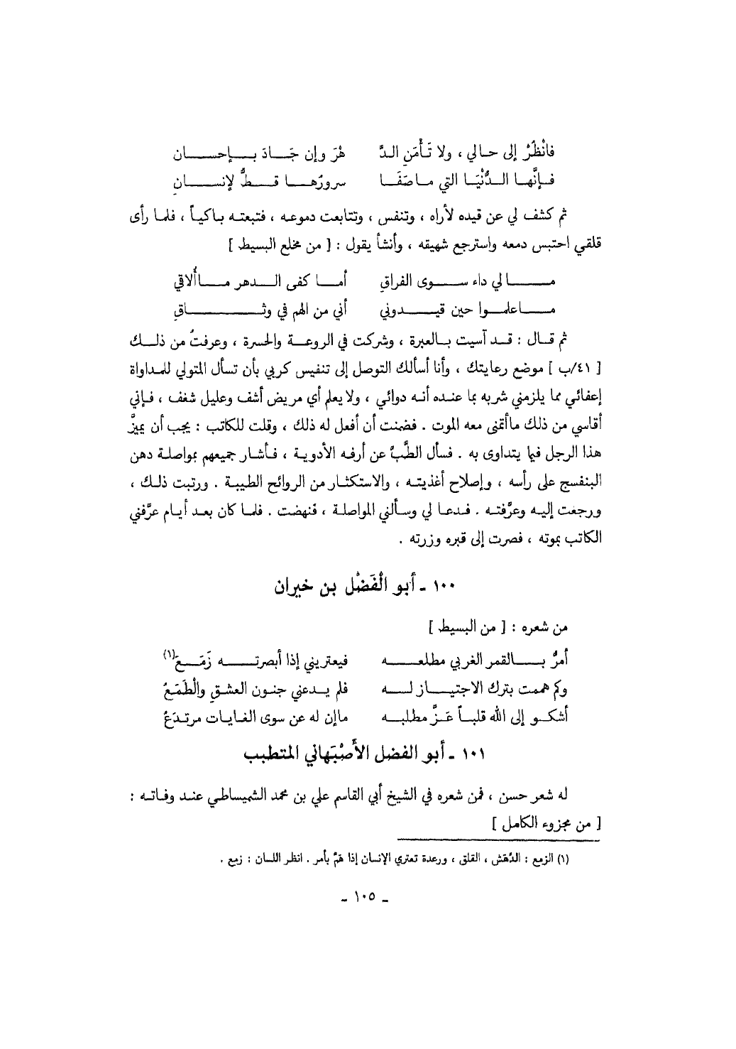ثم قال: قد آسيت بالعبرة، وشركت في الروعة والحسرة، وعرفت من ذلم موضع رعايتك، وأنا أسألك التوصل إلى تنفيس كربي بأن تسأل المتولي للمداواة إعفائي مما يلزمني شربه بما عنده أنه دوائي، ولا يعلم أي مريض أشف وعليل شغف، فإني أقاسي من ذلك ما أتمنى معه الموت. فضمنت أن أفعل له ذلك، وقلت للكاتب: يجب أن يميز هذا الرجل فيما يتداوى به. فسأل الطب عن أرفه الأدوية، فأشار جميعهم بمواصلة دهن البنفسج على رأسه، وإصلاح أغذيته، والاستكثار من الروائح الطيبة. ورتبت ذلك، ورجعت إليه وعرفته. فدعا لي وسألني المواصلة، فنهضت. فلما كان بعد أيام عرفني الكاتب بموته، فصرت إلى قبره وزرته.