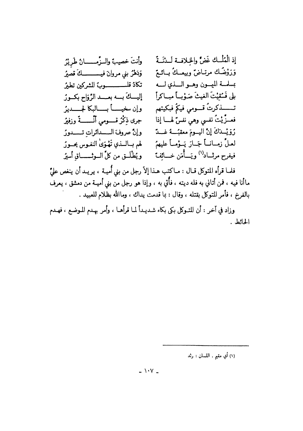 فلما قرأه المتوكل قال: ما كتب هذا إلا رجل من بني أمية، يريد أن ينغص علي ما أنا فيه، فمن أتاني به فله ديته، فأتي به، وإذا هو رجل من بني أمية من دمشق، يعرف بالفرخ، فأمر المتوكل بقتله، وقال: بما قدمت يداك، وما الله بظلام العبيد. وزاد في آخره: أن المتوكل بكى بكاءً شديداً لما قرأها، وأمر بهدم الموضع، فهدم الحائط.