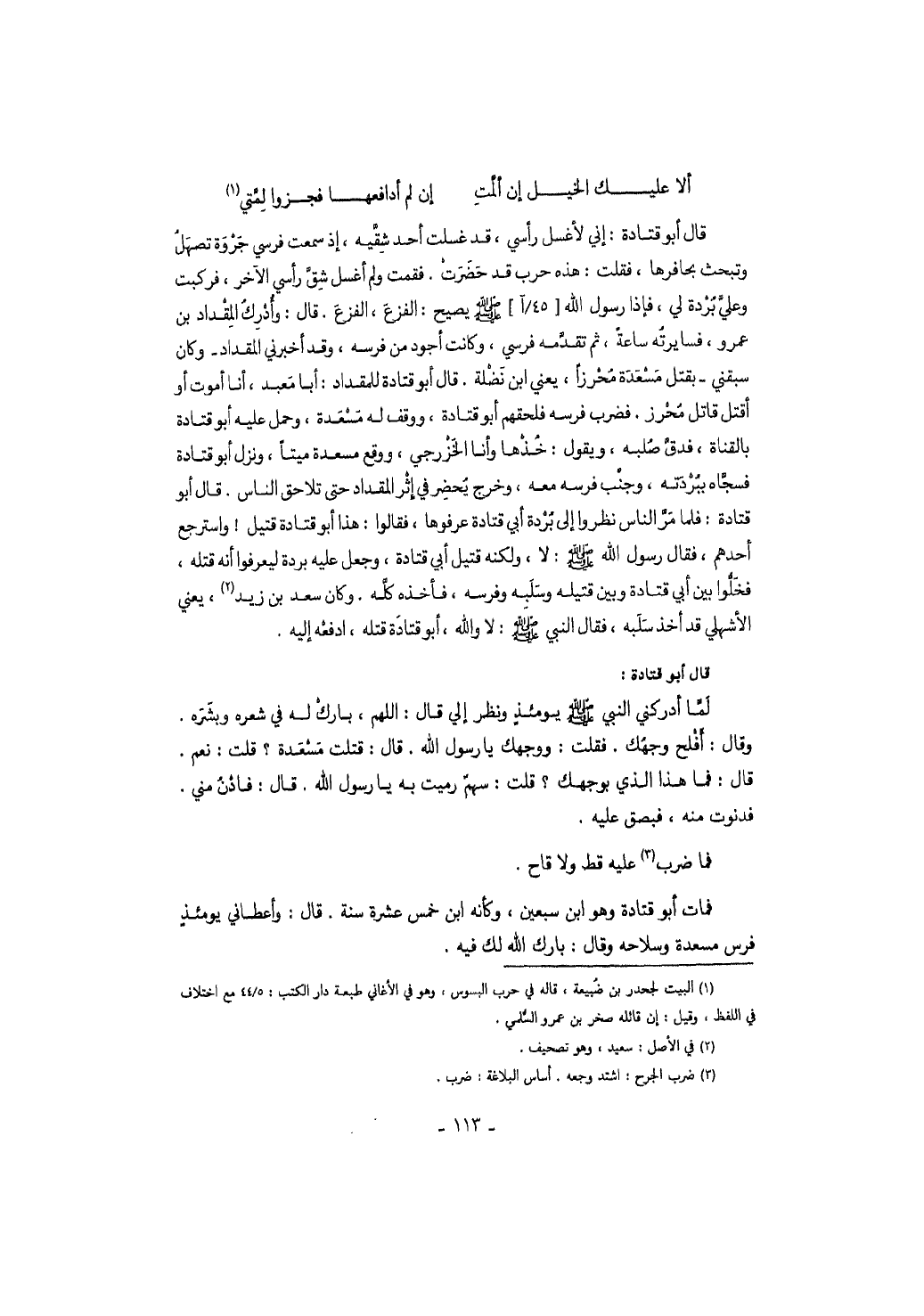 فلما مر الناس نظروا إلى بردة أبي قتادة عرفوها، فقالوا: هذا أبو قتادة قتيل! واسترجع أحدهم، فقال رسول الله صَلَّى اللهُ عَلَيْهِ وَسَلَّمَ: لا، ولكنه قتيل أبي قتادة، وجعل عليه بردة ليعرفوا أنه قتله، فخلوا بين أبي قتادة وبين قتيله وسلبه وفرسه، فأخذه كله. وكان سعد بن زيد يعني الأشهلي قد أخذ سلبه، فقال النبي صَلَّى اللهُ عَلَيْهِ وَسَلَّمَ: لا والله، أبو قتادة قتله، ادفعه إليه. قال أبو قتادة: لما أدركني النبي صَلَّى اللهُ عَلَيْهِ وَسَلَّمَ يومئذ ونظر إلي قال: اللهم، بارك له في شعره وبشره. وقال: أفلح وجهك. فقلت: ووجهك يا رسول الله. قال: قتلت مسعدة؟ قلت: نعم. قال: فما هذا الذي بوجهك؟ قلت: سهم رميت به يا رسول الله. قال: فادن مني. فدنوت منه، فبصق عليه. فما ضرب عليه قط ولا قاح. فمات أبو قتادة وهو ابن سبعين، وكأنه ابن خمس عشرة سنة. قال: وأعطاني يومئذٍ فرس مسعدة وسلاحه وقال: بارك الله لك فيه.