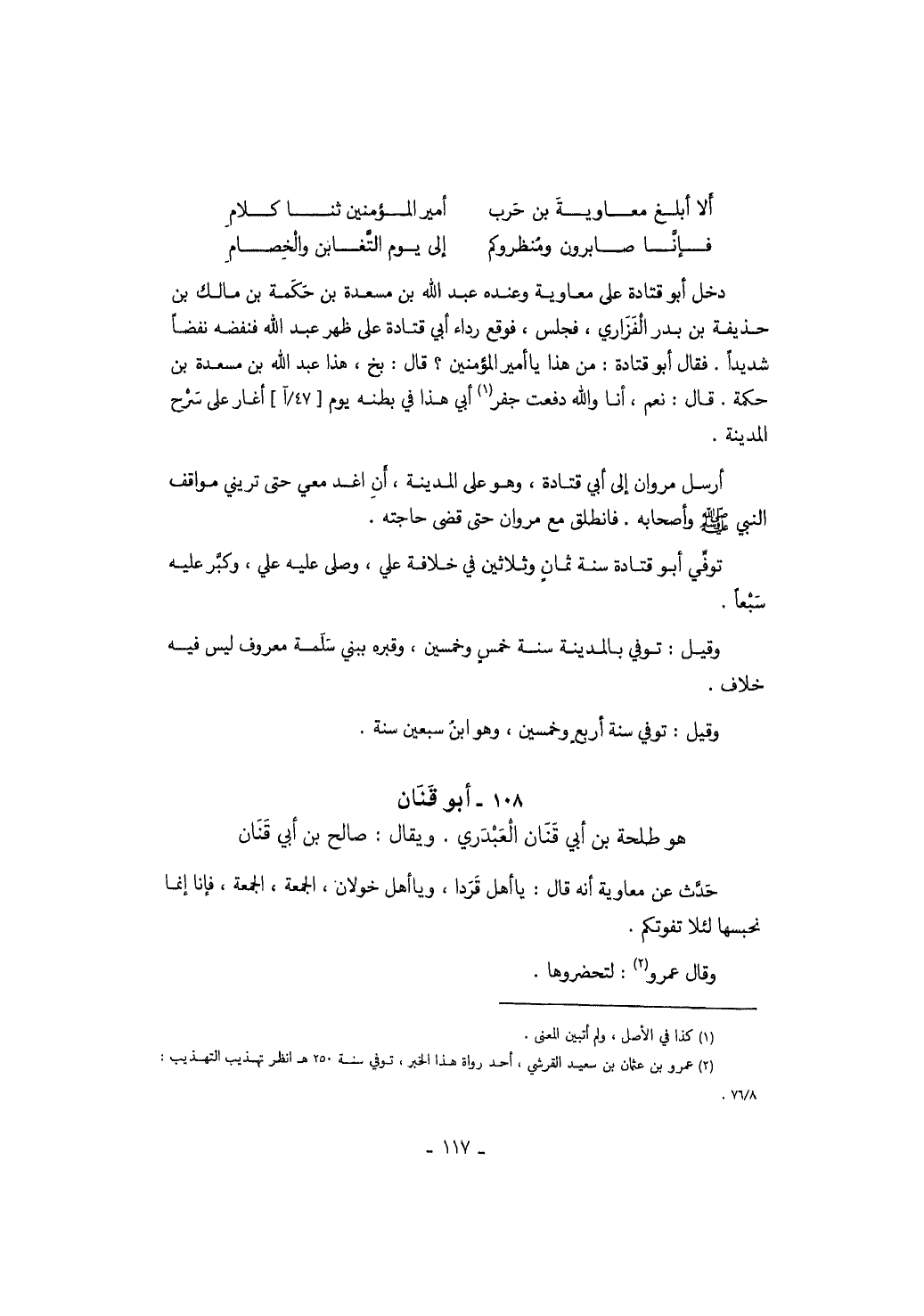 هو طلحة بن أبي قنان العبدري. ويقال: صالح بن أبي قنان حدث عن معاوية أنه قال: يا أهل قردا، ويا أهل خولان، الجمعة، الجمعة، فإنا إنما نحسبها لئلا تفوتكم. وقال عمرو: لتحضروها.