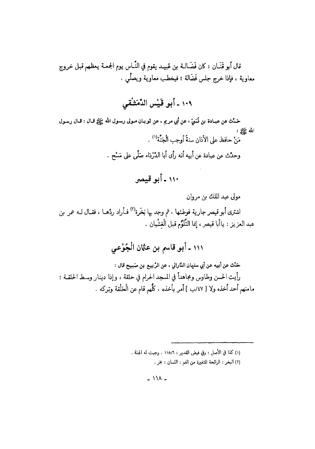 حدث عن عبادة بن نسي، عن أبي مريم، عن ثوبان مولى رسول الله صَلَّى اللهُ عَلَيْهِ وَسَلَّمَ قال: قال رسول الله صَلَّى اللهُ عَلَيْهِ وَسَلَّمَ: من حافظ على الأذان سنة أوجب الجنة. وحدث عن عبادة بن أبيه أنه رأى أبا الدرداء صلى على مسح.