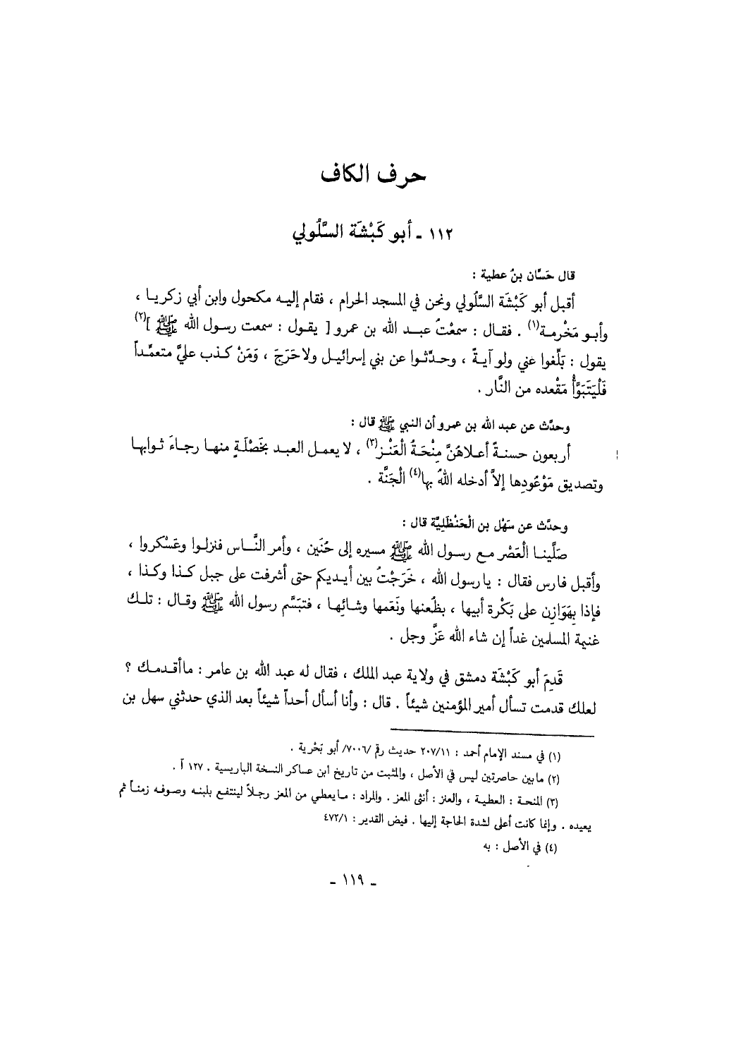 قال حسان بن عطية: أقبل أبو كبشة السلولي ونحن في المسجد الحرام فقام إليه مكحول وابن أبي زكريا، وأبو مخرمة. فقال: سمعت عبد بن عمرو يقول: سمعت رسول الله صَلَّى اللهُ عَلَيْهِ وَسَلَّمَ يقول: بلغوا عني ولو آية، وحدثوا عن بني إسرائيل ولا حرج، ومن كذب علي متعمداً فليتبوأ مقعده من النار. وحدث عن عبد الله بن عمرو أن النبي صَلَّى اللهُ عَلَيْهِ وَسَلَّمَ قال: أربعون حسنة أعلاهن منحة العنز، لا يعمل العبد بخصلة منها رجاء ثوابها وتصديق موعودها إلا أدخله الله بها الجنة. وحدث عن سهل بن الحنظلية قال: صلينا العصر مع رسول الله صَلَّى اللهُ عَلَيْهِ وَسَلَّمَ مسيره إلى حنين، وأمر الناس فنزلوا وعسكروا، وأقبل فارس فقال: يا رسول الله، خرجت بين أيديكم حتى أشرفت على جبل كذا وكذا، فإذا بهوازن على بكرة أبيها، بظعنها ونعمها وشائها، فتبسم رسول الله صَلَّى اللهُ عَلَيْهِ وَسَلَّمَ وقال: تلك غنيمة المسلمين غداً إن شاء الله عز وجل. قدم أبو كبشة دمشق في ولاية عبد الملك، فقال له عبد الله بن عامر: ما أقدمك؟ لعلك قدمت تسأل أمير المؤمنين شيئاً. وأنا أسأل أحداً شيئاً بعد الذي حدثني سهل بن