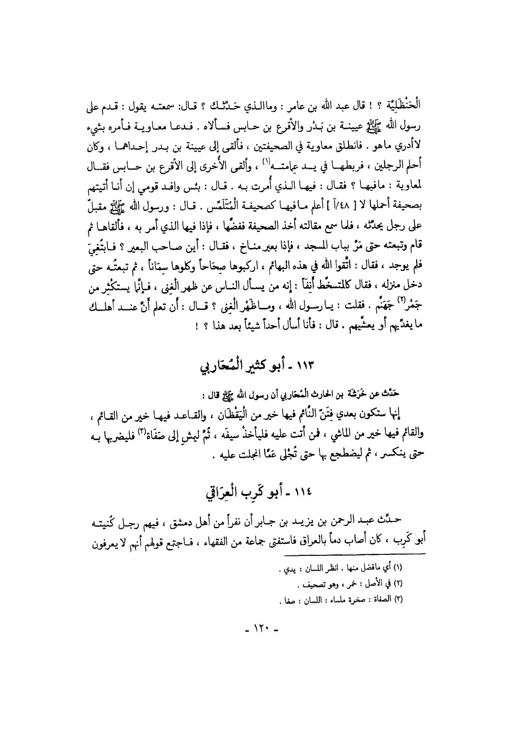 حدث عن خرشة بن الحارث المحاربي أن رسول الله صَلَّى اللهُ عَلَيْهِ وَسَلَّمَ قال: إنها ستكون بعدي فتن النائم فيها خير من اليقظان، والقاعد فيها خير من القائم، والقائم فيها خير من الماشي، فمن أتت عليه فليأخذ سيفه، ثم ليمش إلى صفاة فليضربها به حتى ينكسر، ثم ليضطجع بها حتى تجلى عما انجلت عليه.
