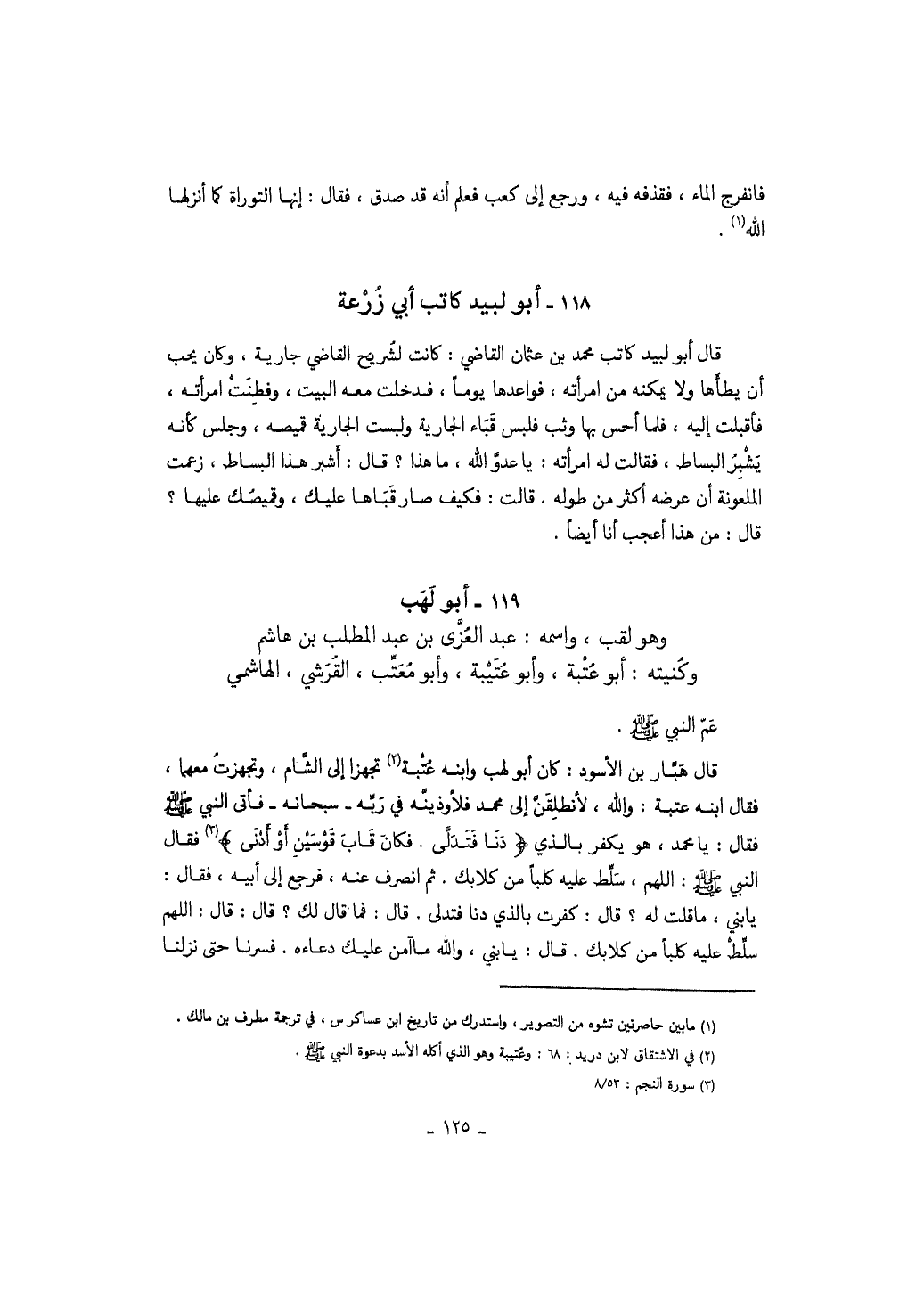 وهو لقب، واسمه: عبد العزى بن عبد المطلب بن هاشم وكنيته: أبو عتبه، وأبو معتب، القرشي الهاشمي عم النبي صَلَّى اللهُ عَلَيْهِ وَسَلَّمَ. قال هبار بن الأسود: كان أبو لهب وابنه عتبة تجهزا إلى الشام، وتجهزت معهما، فقال ابنه عتبة: والله، لأنطلقن إلى محمد فلأوذينه في ربه سبحانه فأتى النبي صَلَّى اللهُ عَلَيْهِ وَسَلَّمَ فقال: يا محمد، هو يكفر بالذي " دنا فتدلى. فكان قاب قوسين أو أدنى " فقال النبي صَلَّى اللهُ عَلَيْهِ وَسَلَّمَ: اللهم، سلط عليه كلباً من كلابك. قال: يا بني، والله ما آمن عليك دعاءه. فسرنا حتى نزلنا