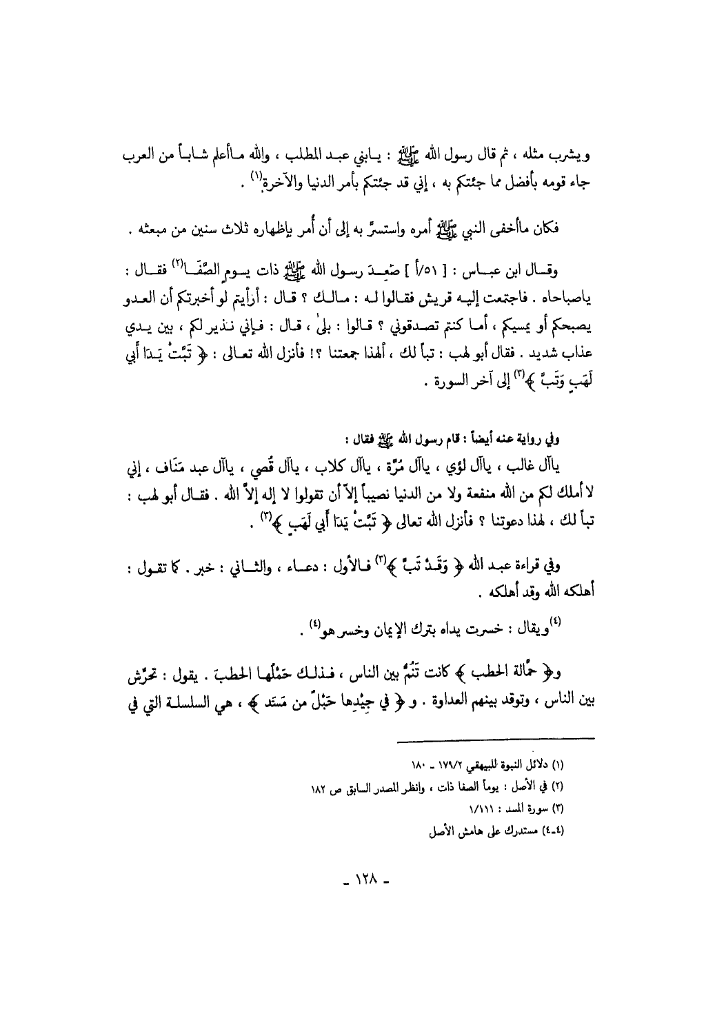 وقال ابن عباس: صعد رسول الله صَلَّى اللهُ عَلَيْهِ وَسَلَّمَ ذات يوم الصفا فقال: يا صباحاه. فاجتمعت إليه قريش فقالوا له: ما لك؟ قال: أرأيتم لو أخبرتكم أن العدو يصبحكم أو يمسيكم، أما كنتم تصدقوني؟ قالوا: بلى، قال: فإني نذير لكم، بين يدي عذاب شديد. فقال أبو لهب: تباً لك، ألهذا جمعتنا؟! فأنزل الله تعالى: " تبت يدا أبي لهب وتب " إلى آخر السورة. وفي رواية عنه أيضاً: قام رسول الله صَلَّى اللهُ عَلَيْهِ وَسَلَّمَ فقال: يا آل غالب، يا لؤي، يا آل مرة، يا آل كلاب، يا آل قصي، يا آل عبد مناف، إني لا أملك لكم من الله منفعة ولا من الدنيا نصيباً إلا أن تقولوا لا إله إلا الله. فقال أبو لهب: تباً لك، لهذا دعوتنا؟ فأنزل الله تعالى: " تبت يدا أبي لهب وتب ". وفي قراءة عبد الله " وقد تب " فالأول: دعاء، والثاني: خبر. كما تقول: أهلكه الله وقد أهلكه. ويقال: خسرت يداه بترك الإيمان وخسر هو. و" حمالة الحطب " كانت تنم بين الناس، فذلك حملها الحطب. يقول: تحرش بين الناس، وتوقد بينهم العداوة. و" في جيدها حبل من مسد "، هي السلسلة التي في