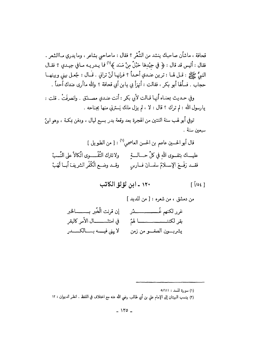 لا، لم يزل ملك يسترني منها بجناحه. توفي أبو لهب سنة اثنتين من الهجرة بعد وقعة بدر بسبع ليال، ودفن بمكة، وهو ابن سبعين سنة. قال أبو الحسين عاصم بن الحسن العاصمي: من الطويل