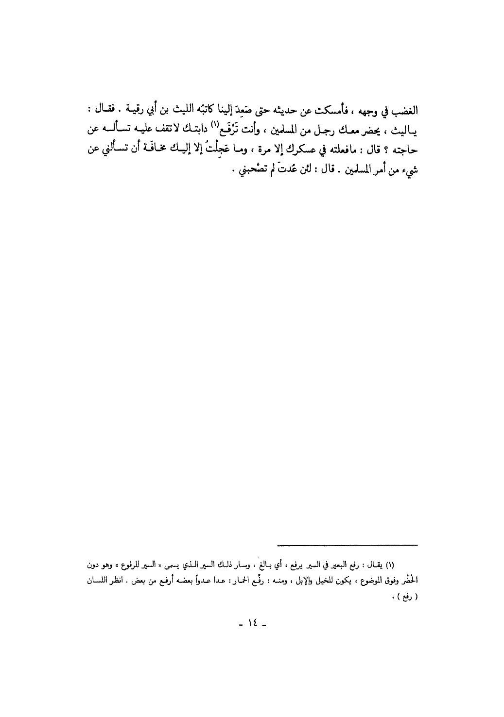 الغضب في وجهه، فأمسكت عن حديثه حتى صعد إلينا كاتبه الليث بن أبي رقية. فقال: يا ليث، يحضر معك رجل من المسلمين، وأنت ترفع دابتك لا تقف عليه تسأله عن حاجته؟ قال: ما فعلته في عسكرك إلا مرة، وما عجلت إلا إليك مخافة أن تسألني عن شيء من أمر المسلمين. قال: لئن عدت لم تصحبني.