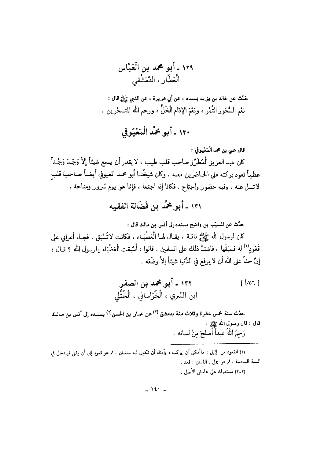 حدث عن المسيب بن واضح بسنده إلى أنس بن مالك قال: كان لرسول الله صَلَّى اللهُ عَلَيْهِ وَسَلَّمَ ناقة، يقال لها العضباء، فكانت لا تسبق. فجاء أعرابي على قعود له فسبقها، فاشتد ذلك على المسلمين. قالوا: أسبقت العضباء يا رسول الله؟ قال: إن حقاً على الله أن لا يرفع في الدنيا شيئاً إلا وضعه.