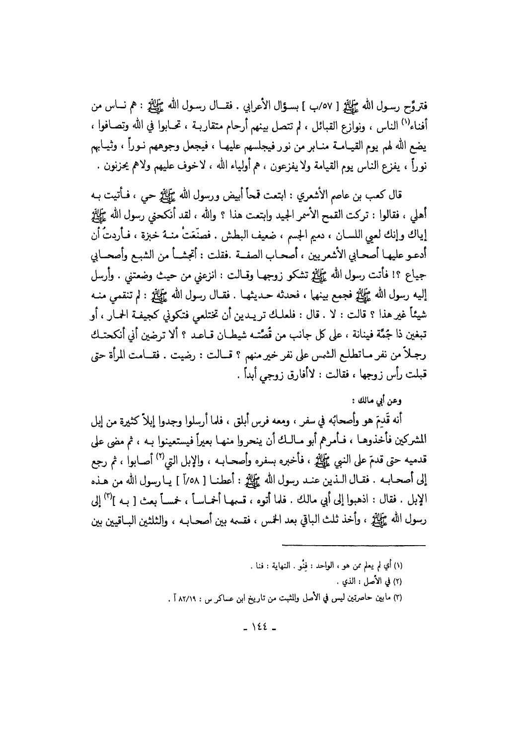 فتروح رسول الله صَلَّى اللهُ عَلَيْهِ وَسَلَّمَ بسؤال الأعرابي. فقال رسول الله صَلَّى اللهُ عَلَيْهِ وَسَلَّمَ: هم ناس من أفناء الناس، ونوازع القبائل، لم تتصل بينهم أرحام متقاربة، تحابوا في الله وتصافوا، يضع الله لهم يوم القيامة منابر من نور فيجلسهم عليها، فيجعل وجوههم نوراً، وثيابهم نوراً، يفزع الناس يوم القيامة ولا يفزعون، هم أولياء الله، لا خوف عليهم ولا هم يحزنون. قال كعب بن عاصم الأشعري: ابتعت قمحاً أبيض ورسول الله صَلَّى اللهُ عَلَيْهِ وَسَلَّمَ حي، فأتيت به أهلي، فقالوا: تركت القمح الأسمر الجيد وابتعت هذا؟ والله لقد أنكحني رسول الله صَلَّى اللهُ عَلَيْهِ وَسَلَّمَ إياك وإنك لعيي اللسان، دميم الجسم، ضعيف البطش. فصنعت منه خبزة، فأردت أن أدعو عليها أصحابي الأشعريين، أصحاب الصفة. فقلت: أتجشأ من الشبع وأصحابي جياع؟! فأتت رسول الله صَلَّى اللهُ عَلَيْهِ وَسَلَّمَ تشكو زوجها وقالت: انزعني من حيث وضعتني. وأرسل إليه رسول الله صَلَّى اللهُ عَلَيْهِ وَسَلَّمَ فجمع بينهما، فحدثه حديثها. فقال رسول الله صَلَّى اللهُ عَلَيْهِ وَسَلَّمَ: لم تنقمي منه شيئاً غير هذا؟! قالت: لا. قال: فلعلك تريدين أن تخلعي فتكوني كجيفة الحمار، أو تبغين ذا جمة فينانة، على كل جانب من قصته شيطان قاعد؟ ألا ترضين أني أنكحتك رجلاً من نفر ما تطلع الشمس على نفر خير منهم؟ قالت: رضيت. فقامت المرأة حتى قبلت رأس زوجها، فقالت: لا أفارق زوجي أبداً. وعن أبي مالك: أنه قدم هو وأصحابه في سفر، ومعه فرس أبلق، فلما أرسلوا وجدوا إبلاً كثيرة من إبل المشركين فأخذوها، فأمرهم أبو مالك أن ينحروا منها بعيراً فيستعينوا به، ثم مضى على قدميه حتى قدم على النبي صَلَّى اللهُ عَلَيْهِ وَسَلَّمَ، فأخبره بسفره وأصحابه، والإبل التي أصابوا، ثم رجع إلى أصحابه. فقال الذين عند رسول الله صَلَّى اللهُ عَلَيْهِ وَسَلَّمَ: أعطنا يا رسول الله من هذه الإبل. فقال: اذهبوا إلى أبي مالك. فلما أتوه، قسمها أخماساً، خمساً بعث به إلى رسول الله صَلَّى اللهُ عَلَيْهِ وَسَلَّمَ، وأخذ ثلث الباقي بعد الخمس، فقسمه بين أصحابه، والثلثين الباقيين بين