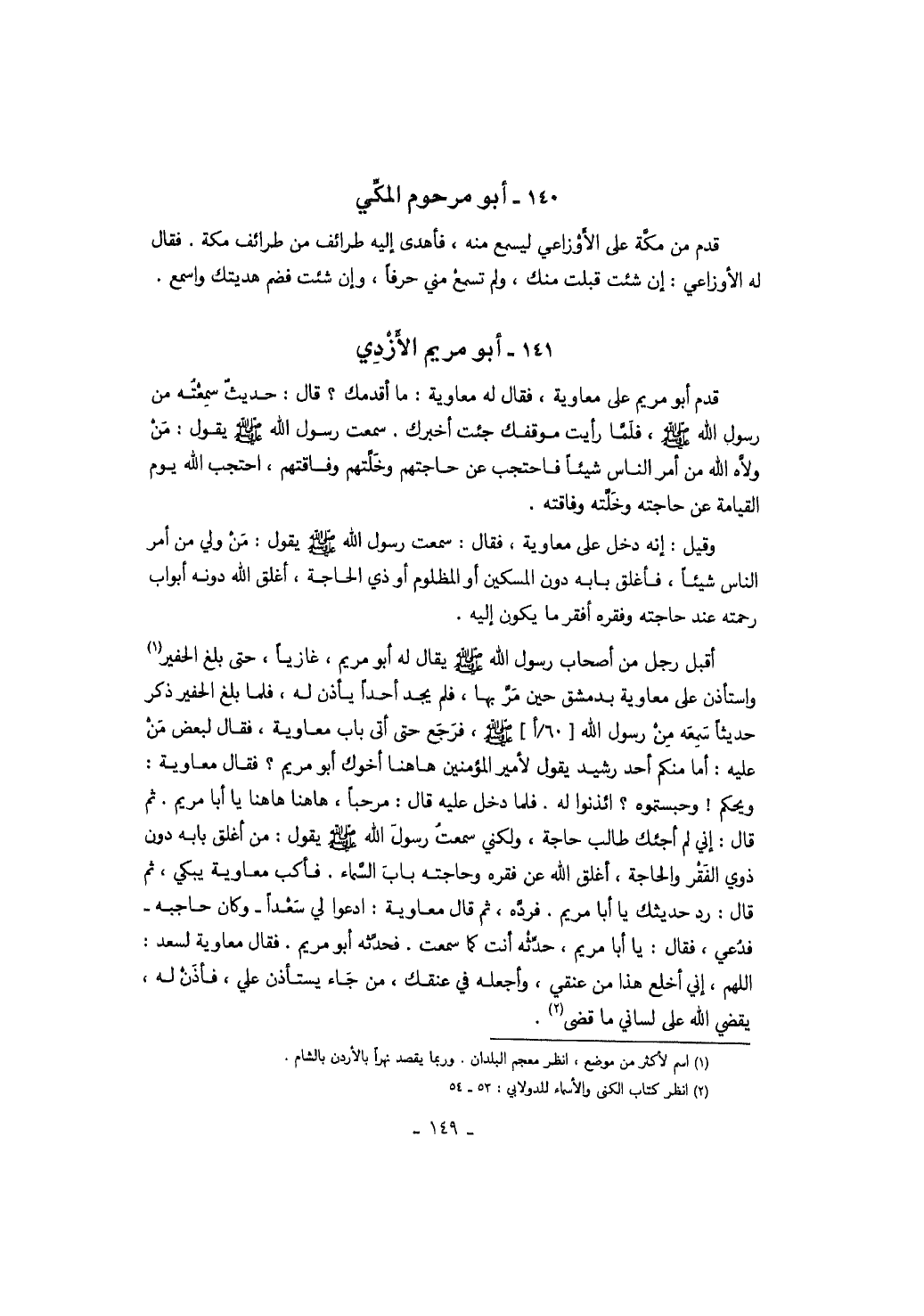 أقبل رجل من أصحاب رسول الله صَلَّى اللهُ عَلَيْهِ وَسَلَّمَ يقال له أبو مريم، غازياً، حتى بلغ الحفير واستأذن على معاوية بدمشق حين مر بها، فلم يجد أحداً يأذن له، فلما بلغ الحفير ذكر حديثاً سمعه من رسول الله صَلَّى اللهُ عَلَيْهِ وَسَلَّمَ، فرجع حتى أتى باب معاوية، فقال لبعض من عليه: أما منكم أحد رشيد يقول لأمير المؤمنين ها هنا أخوك أبو مريم؟ فقال معاوية: ويحكم! وحبستموه؟ ائذنوا له. فلما دخل عليه قال: مرحباً، ها هنا ها هنا يا أبا مريم. ثم قال: إني لم أجئك طالب حاجة، ولكني سمعت رسول الله صَلَّى اللهُ عَلَيْهِ وَسَلَّمَ يقول: من اغلق بابه دون ذوي الفقر والحاجة، أغلق الله عن فقره وحاجته باب السماء. فأكب معاوية يبكي، ثم قال: رد حديثك يا أبا مريم. فرده، ثم قال معاوية: ادعوا لي سعداً وكان حاجبه فدعي، فقال: يا أبا مريم، حدثه أنت كما سمعت. فحدثه أبو مريم. فقال معاوية لسعد: اللهم، إني أخلع هذا من عنقي، وأجعله في عنقك، من جاء يستأذن علي، فأذن له، يقضي الله على لساني ما قضى.