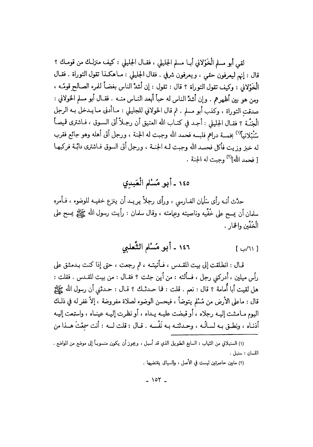 لقي أبو مسلم الخولاني أبا مسلم الجليلي، فقال الجليلي: كيف منزلك من قومك؟ قال: إنهم ليعرفون حقي، ويعرفون شرفي. فقال الجليلي: ما هكذا تقول التوراة. فقال الخولاني: وكيف تقول التوراة؟ قال: تقول: إن أشد الناس بغضاً للمرء الصالح قومه، ومن هو بين أظهرهم. وإن أشد الناس له حباً أبعد الناس منه. فقال أبو مسلم الخولاني: صدقت التوراة، وكذب أبو مسلم. ثم قال الخولاني للجليلي: ما أدنى ما يدخل به الرجل الجنة؟ فقال الجليلي: أجد في كتاب الله العتيق أن رجلاً أتى السوق، فاشترى قميصاً سنبلانياً بخمسة دراهم فلبسه فحمد الله وجبت له الجنة، ورجل أتى أهله وهو جائع فقرب له خبز وزيت فأكل فحمد الله وجبت له الجنة، ورجل أتى السوق فاشترى دابة فركبها فحمد الله وجبت له الجنة.