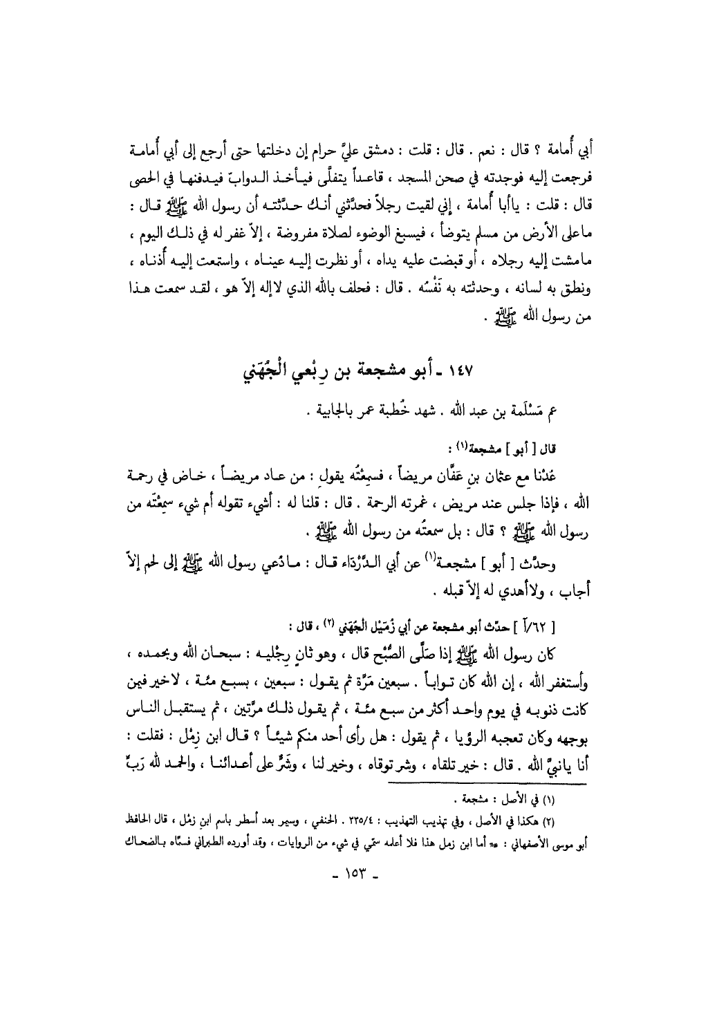 قال أبو مشجعة: عدنا مع عثمان بن عفان مريضاً، فسمعته يقول: خاض في رحمة الله، فإذا جلس عند مريض، غمرته الرحمة. قال: قلنا له: أشيء سمعته من رسول الله صَلَّى اللهُ عَلَيْهِ وَسَلَّمَ؟ قال: بل سمعته من رسول الله صَلَّى اللهُ عَلَيْهِ وَسَلَّمَ. وحدث أبو مشجعة عن أبي الدرداء قال: ما دعي رسول الله صَلَّى اللهُ عَلَيْهِ وَسَلَّمَ إلى لحم إلا أجاب، ولا أهدي له إلا قبله. حدث أبو مشجعة عن أبي زميل الجهني، قال: كان رسول الله صَلَّى اللهُ عَلَيْهِ وَسَلَّمَ إذا صلى الصبح قال، وهو ثانٍ رجليه: سبحان الله وبحمده، وأستغفر الله، إن الله كان تواباً. سبعين مرة ثم يقول: سبعين، بسبع مئة، لا خير فيمن كانت ذنوبه في يوم واحد أكثر من سبع مئة، ثم يقول ذلك مرتين، ثم يستقبل الناس بوجهه وكان تعجبه الرؤيا، ثم يقول: هل رأى أحد منكم شيئاً؟ قال ابن زمل: فقلت: أنا يا نبي الله. قال: خير تلقاه، وشر توقاه، وخير لنا، وشر على أعدائنا، والحمد لله رب