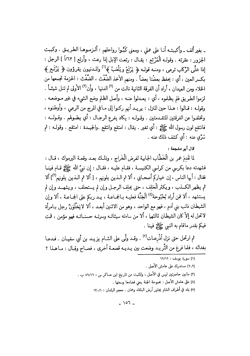 بغير ألف وأكببته أنا على عملي، ومعنى كبوا رواحلهم: ألزموها الطريق. وكببت الجزور: عقرته. وقوله المرتع: يقال: رتعت الإبل إذا رعت، وأرتع الرجل: إذا خلى الركاب ترعى، ومنه قوله " يرتع ويلعب " والمدنيون يقرؤون " يرتع " بكسر العين، أي: يحفظ بعضنا بعضاً. ومنهم الآخذ الضغث، الضغث: الحزمة تجمعها من الخلاء ومن العيدان، أراد أن الفرقة الثانية نالت من الدنيا، وأن الأولى لم تنل شيئاً. لزموا الطريق فلم يظلموه، أي: يعدلوا عنه، وأصل الظلم وضع الشيء في غير موضعه. وقوله: قالوا: هذا حين المنزل: يريد أنهم ركنوا إلى ما في المرج من الرعي، وأوطنوه، وتخلفوا عن الفرقتين المتقدمتين. وقوله: يكاد يفرع الرجال: أي يطولهم. وقوله: فانتقع لون رسول الله صَلَّى اللهُ عَلَيْهِ وَسَلَّمَ: أي تغير. يقال: امتقع وانتقع. والجيدة: امتقع. وقوله: ثم سري عنه: أي كشف ذلك عنه. قال أبو مشجعة: لما قدم عمر بن الخطاب الجابية لفرض الخراج، وذلك بعد وقعة اليرموك، قال: فشهدته دعا بكرسي من كراسي الكنيسة، فقام عليه، فقال: إن نبي الله صَلَّى اللهُ عَلَيْهِ وَسَلَّمَ قام فينا فقال: أيها الناس، إن خياركم أصحابي، ألا ثم الذين يلونهم ألا ثم يظهر الكذب، ويكثر الحلف، حتى يحلف الرجل وإن لم يستحلف، ويشهد وإن لم يستشهد، ألا فمن أراد بحبوحة الجنة فعليه بالجماعة، يد ربكم على الجماعة، ألا وإن الشيطان ذئب بني آدم، فهو مع الواحد، وهو من الاثنين أبعد، ألا لا يخلون رجل بامرأة لا تحل له إلا كان الشيطان ثالثهما، ألا من ساءته سيئاته وسرته حسناته فهو مؤمن، قمت فيكم بقد ما قام به النبي صَلَّى اللهُ عَلَيْهِ وَسَلَّمَ فينا.