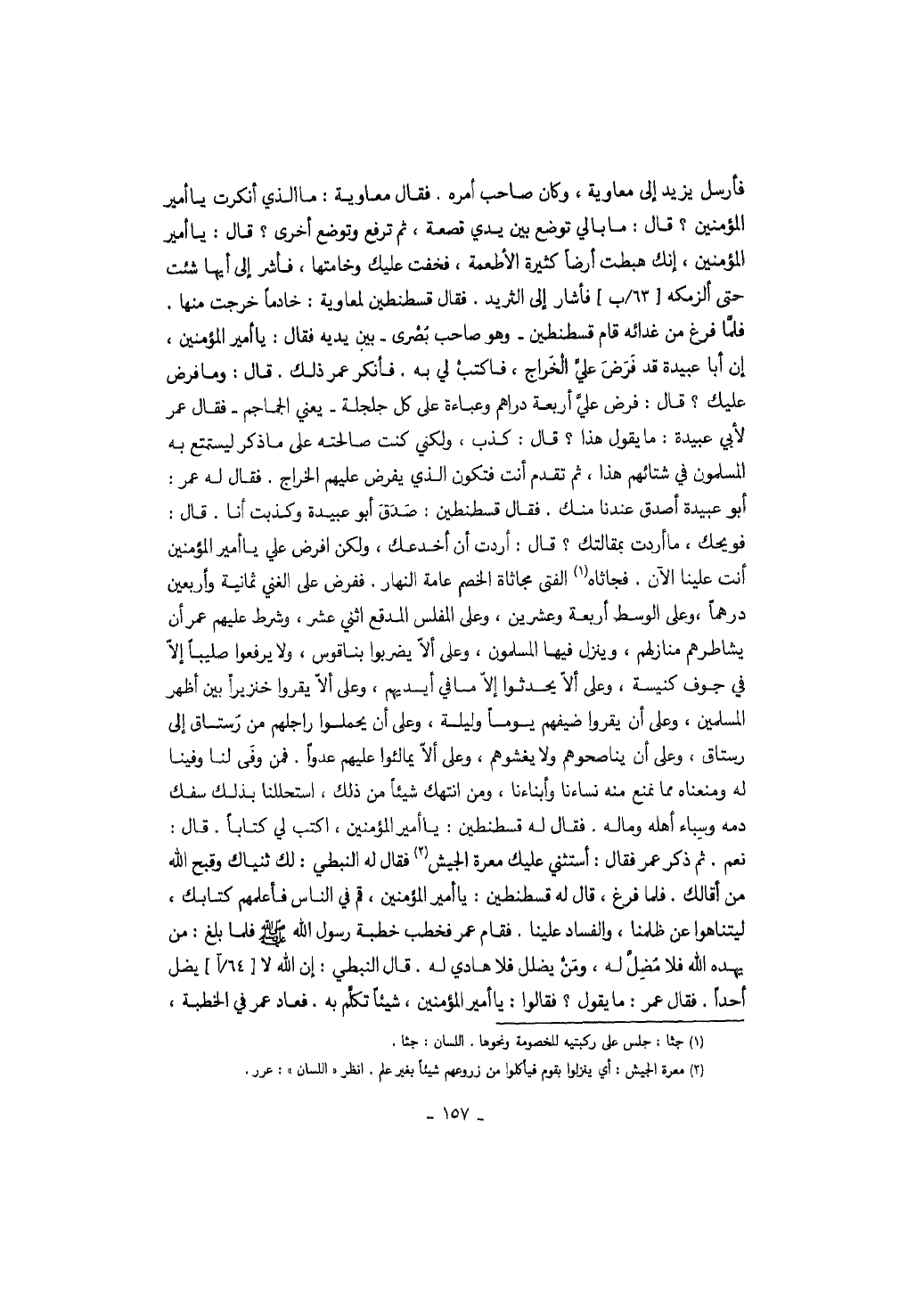 فأرسل يزيد إلى معاوية، وكان صاحب أمره. فقال معاوية: ما الذي أنكرت يا أمير المؤمنين؟ قال: ما بالي توضع بين يدي قصعة، ثم ترفع وتوضع أخرى؟ قال: يا أمير المؤمنين، إنك هبطت أرضاً كثيرة الأطعمة، فخفت عليك وخامتها، فأشر إلى أيها شئت حتى ألزمكه فأشار إلى الثريد. فقال قسطنطين لمعاوية: خادماً خرجت منها. فلما فرغ من غذائه قام قسطنطين وهو صاحب بصرى بينيديه فقال: يا أمير المؤمنين، إن أبا عبيدة قد فرض علي الخراج، فاكتب لي به. فأنكر عمر ذلك. قال: وما فرض عليك؟ قال: فرض علي أربعة دراهم وعباءة على كل جلجلة يعني الجماجم فقال عمر لأبي عبيدة: ما يقول هذا؟ قال: كذب، ولكني كنت صالحته على ما ذكر ليستمتع به المسلمون في شتائهم هذا، ثم تقدم أنت فتكون الذي يفرض عليهم الخراج. فقال له عمر: أبو عبيدة أصدق عندنا منك. فقال قسطنطين: صدق أبو عبيدة وكذبت أنا. قال: فويحك، ما أردت بمقالتك؟ قال: أردت أن أخدعك، ولكن افرض علي يا أمير المؤمنين أنت علينا الآن. فجاثاه الفتى مجاثاة الخصم عامة النهار. ففرض على الغني ثمانية وأربعين درهماً، وعلى الوسط أربعة وعشرين، وعلى المفلس المدقع اثني عشر، وشرط عليهم عمر أن يشاطرهم منازلهم، وينزل فيها المسلمون، وعلى ألا يضربوا بناقوس، ولا يرفعوا صليباً إلا في جوف كنيسة، وعلى ألا يحدثوا إلا ما في أيديهم، وعلى ألا يقروا خنزيراً بين أظهر المسلمين، وعلى أن يقروا ضيفهم يوماً وليلة، وعلى أن يحملوا راجلهم من رستاق إلى رستاق، وعلى أن يناصحوهم ولا يغشوهم، وعلى ألا يمالئوا عليهم عدواً. فمن وفى لنا وفينا له ومنعناه مما نمنع منه نساءنا وأبناءنا، ومن انتهك شيئاً من ذلك، استحللنا بذلك سفك دمه وسباء أهله وماله. فقال له قسطنطين: يا أمير المؤمنين، اكتب لي كتاباً. قال: نعم. ثم ذكر عمر فقال: أستثني عليك معرة الجيش فقال له النبطي: لك ثنياك وقبح الله من أقالك. فلما فرغ، قال له قسطنطين: يا أمير المؤمنين، قم في الناس فأعلمهم كتابك، ليتناهوا عن ظلمنا، والفساد علينا. فقام عمر فخطب خطبة رسول الله صَلَّى اللهُ عَلَيْهِ وَسَلَّمَ فلما بلغ: من يهده الله فلا مضل له، ومن يضلل فلا هادي له. قال النبطي: إن الله لا يضل أحداً. فقال عمر: ما يقول؟ فقالوا: يا أمير المؤمنين، شيئاً تكلم به. فعاد عمر في الخطبة،