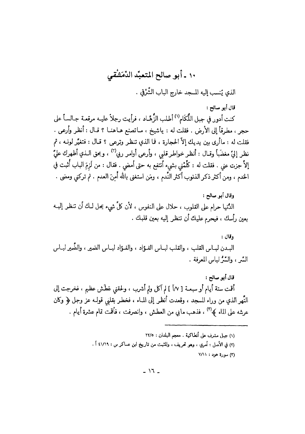 الذي ينتسب إليه المسجد خارج الباب الشرقي. قال أبو صالح: كنت أدور في جبل اللكام أطلب الزهاد، فرأيت رجلاً عليه مرقعة جالساً على حجر، مطرقاً إلى الأرض. فقلت له: يا شيخ، ما تصنع ها هنا؟ قال: أنظر وأرعى. فقلت له: ما أرى بين يديك إلا الحجارة، فما الذي تنظر وترعى؟ قال: فتغير لونه، ثم نظر إلي مغاضباً وقال: أنظر خواطر قلبي، وأرعى أوامر ربي، وبحق الذي أظهرك علي إلا جزت عني. فقلت له: كلمني بشيء أنتفع به حتى أمضي. فقال: من لزم الباب أثبت في الخدم، ومن أكثر ذكر الذنوب أكثر الندم، ومن استغنى بالله أمن العدم. ثم تركني ومضى. وقال أبو صالح: الدنيا حرام على القلوب، حلال على النفوس، لأن كل شيء يحل لك أن تنظر إليه بعين رأسك، فيحرم عليك أن تنظر إليه بعين قلبك. وقال: البدن لباس القلب والقلب لباس الفؤاد، والفؤاد لباس الضمير، والضمير لباس السر، والسر لباس المعرفة. قال أبو صالح: أقمت ستة أيام أو سبعة لم آكل ولم أشرب، ولحقني عطش عظيم، فخرجت إلى النهر الذي من وراء المسجد، وقعدت أنظر إلى الماء، فخطر بقلبي قوله عز وجل " وكان عرشه على الماء "، فذهب ما بي من العطش، انصرفت، فأقمت تمام عشرة أيام.
