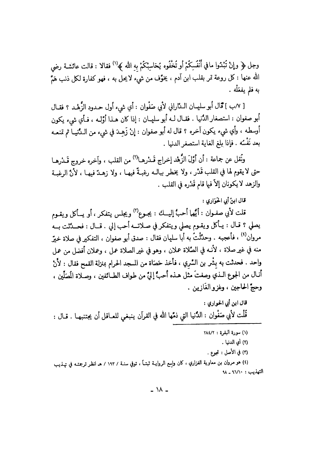وجل " وإن تبدوا ما في أنفسكم أو تخفوه يحاسبكم به الله " فقالا: قالت عائشة رضي الله عنها: كل روعة تمر بقلب ابن آدم، يخوف من شيء لا يحل به، فهو كفارة لكل ذنب هم به فلم يفعله. قال أبو سليمان الداراني لأبي صفوان: أي شيء أول حدود الزهد؟ فقال أبو صفوان: استصغار الدنيا. فقال له أبو سليمان: إذا كان هذا أوله، فأي شيء يكون أوسطه، وأي شيء يكون آخره؟ قال له أبو صفوان: إن زهد في شيء من الدنيا ثم تمنعه بعد نفسه. فإذا بلغ الغاية استصغر الدنيا. ونقل عن جماعة: أن أول الزهد إخراج قدرها من القلب، وآخره خروج قدرها حتى لا يقوم لها في القلب قدر، ولا يخطر بباله رغبة فيها، ولا زهد فيها، لأن الرغبة والزهد لا يكونان إلا فيما قام قدره في القلب. قال ابن أبي الحواري: قلت لأبي صفوان: أيهما أحب إليك: يجوع ويجلس يتفكر، أو يأكل ويقوم يصلي؟ قال: يأكل ويقوم يصلي ويتفكر في صلاته أحب إلي. قال: فحدثت به مروان، فأعجبه. وحدثت به أبا سليمان فقال: صدق أبو صفوان، التفكير في الصلاة خير منه في غير صلاة، لأنه في الصلاة عملان، وهو في غير الصلاة عمل، وعملان أفضل من عمل واحد. فحدثت به بشر بن السري، فأخذ حصاة من المسجد الحرام بمنزلة القمح فقال: لئن أنال من الجوع الذي وصفت مثل هذه أحب إلي من طواف الطائفين، وصلاة المصلين، وحج الحاجين، وغزو الغازين. قال ابن أبي الحواري: قلت لأبي صفوان: الدنيا التي ذمها الله في القرآن ينبغي للعاقل أن يتجنبها. قال: